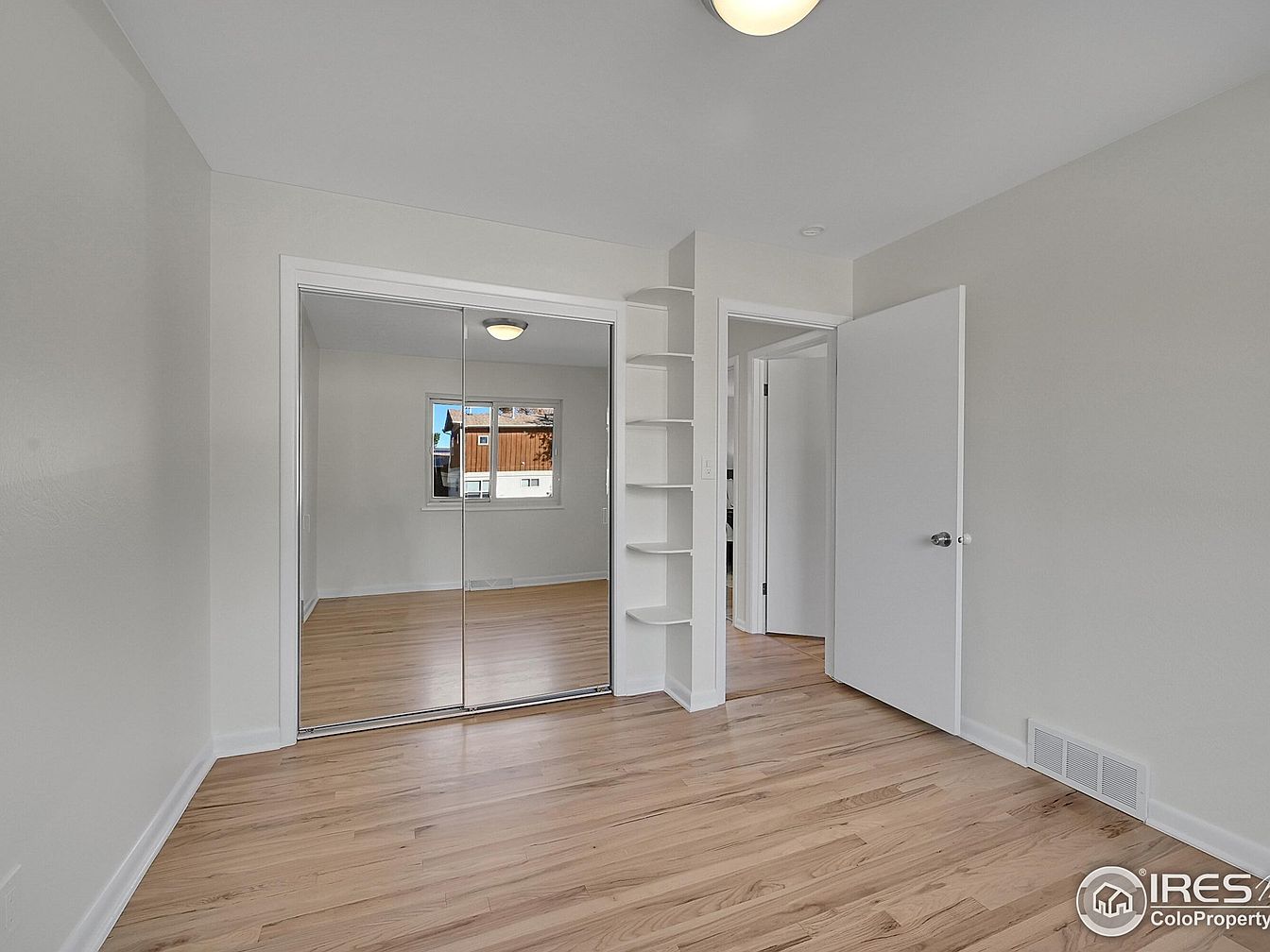 A small, contemporary bedroom featuring light-colored hardwood floors that enhance the airy feel. The walls are painted in a soft white, allowing natural light from a window to illuminate the space. A large mirrored closet occupies one wall, creating depth and reflecting light. On the adjacent wall, a built-in shelf offers additional storage or display options. A simple, modern ceiling light fixture provides overhead illumination. The doorway to the left leads to another room, while minimalistic design elements foster a serene and uncluttered atmosphere, making this a welcoming retreat for relaxation.