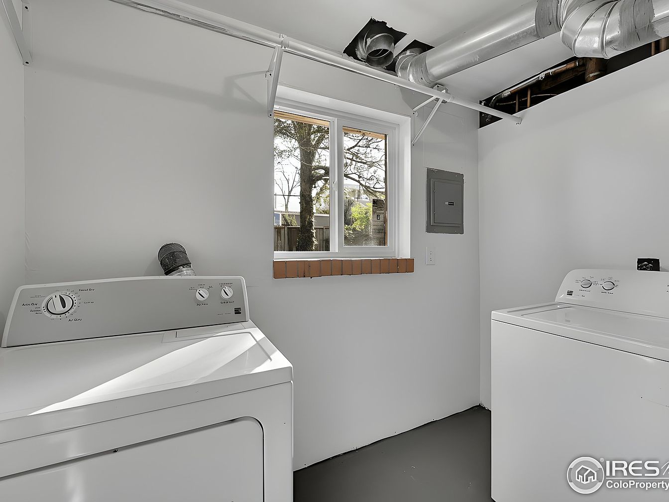 This laundry room features a practical layout with two white appliances: a washer and dryer positioned side by side. The walls are painted a pristine white, enhancing the brightness of the space. A small window allows natural light to flood the room, offering a view of greenery outside, creating an inviting atmosphere. A simple shelf overhead provides storage for laundry essentials. The floor is covered in a dark gray material, contrasting with the light walls and appliances. An electrical panel is mounted on one wall, maintaining the room’s utility-focused design, while the overall aesthetic remains clean and functional.
