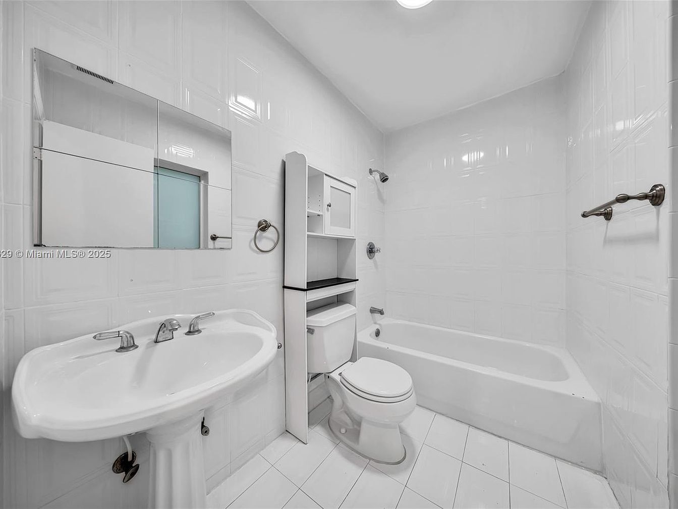 A compact bathroom featuring pristine white tiles lining the walls and floor, creating a clean and bright atmosphere. A porcelain pedestal sink with dual faucets sits prominently, accompanied by a wall-mounted mirror that reflects the light, enhancing the spacious feel. Adjacent to the sink, a modern toilet is positioned beside a bathtub with a sleek, minimalist design. A showerhead is mounted above the tub, suggesting functionality and accessibility. A built-in shelving unit offers storage, displaying a minimalist approach to decor. Overall, the bathroom emphasizes simplicity, cleanliness, and an understated elegance, perfect for everyday use.