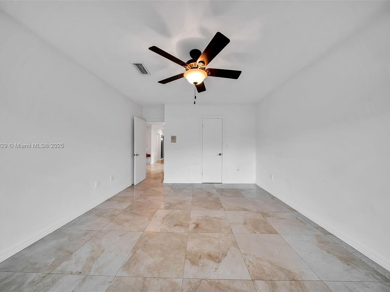 This spacious bedroom features a minimalist design with a light color palette. The walls are painted white, enhancing the airiness of the room. A large ceiling fan with dark blades and a warm light fixture adds practicality and a touch of style. The flooring consists of large, beige and cream-colored tiles exhibiting a subtle marbling effect, providing elegance underfoot. On one side, a doorway leads to a hallway, while the opposite side features a closet door. Natural light flows in through unadorned windows, emphasizing the room’s open and welcoming atmosphere, perfect for relaxation.