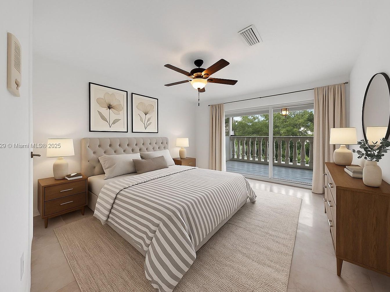 This serene bedroom features a comfortable, tufted queen-sized bed with a soft gray headboard. The bedding, adorned with subtle stripes, complements the neutral palette. Nightstands on both sides, made of warm wood, host stylish table lamps with round bases. Above the bed, two framed botanical prints add a touch of nature. Natural light floods in through a sliding glass door, leading to a small balcony with banister, framed by beige curtains. The room’s flooring is a light, polished tile, while a textured area rug adds warmth. A ceiling fan enhances the airy feel, promoting relaxation.