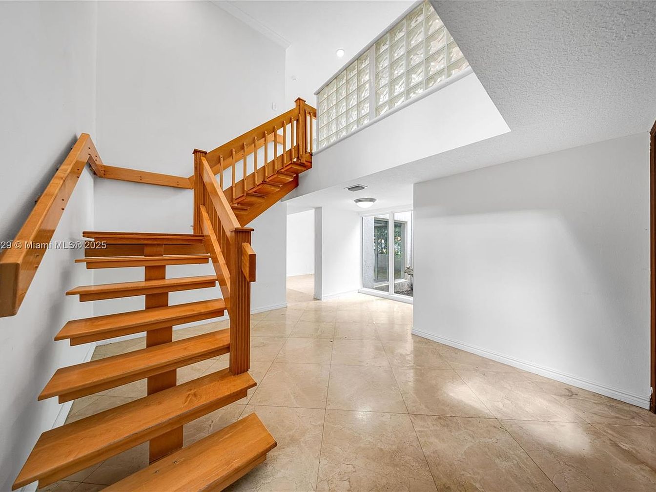 A spacious entryway features a striking wooden staircase leading to the upper level, the steps designed with a clean and modern aesthetic. The warm, natural wood contrasts elegantly against the bright white walls, enhancing the airy feel of the space. Polished marble flooring reflects light beautifully, contributing to a sense of openness. A glass block wall allows soft natural light to filter through, illuminating the hallway without sacrificing privacy. The ceiling is high, with recessed lighting adding a contemporary touch. This entryway seamlessly connects to other areas, inviting visitors into a welcoming and stylish home.