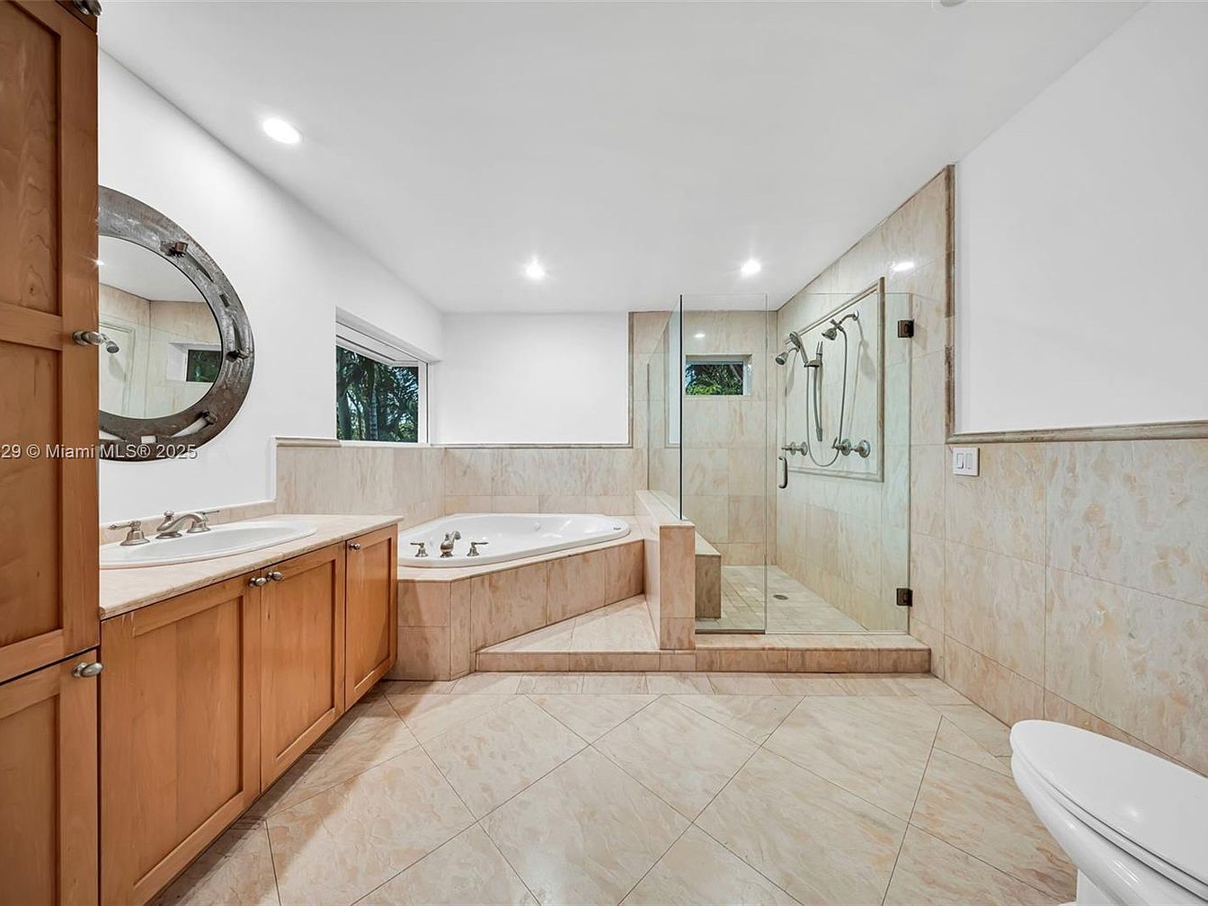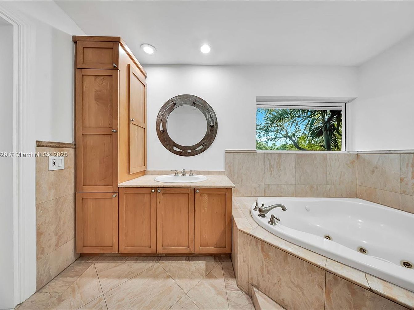 This bathroom features a soothing blend of natural tones and textures, highlighted by its cream-colored tile flooring and marble accents. The spacious layout encompasses a luxurious jacuzzi tub enveloped in tiled walls, offering a refined yet relaxing atmosphere. Solid wood cabinetry in a warm finish provides ample storage, complemented by a distinctive round mirror that adds elegance. Sunlight streams through a window, allowing a view of surrounding greenery, which enhances the room’s serene vibe. Recessed lighting illuminates the space effectively, uniting functionality with soothing aesthetics conducive to relaxation.
