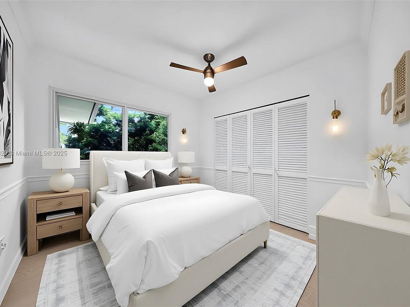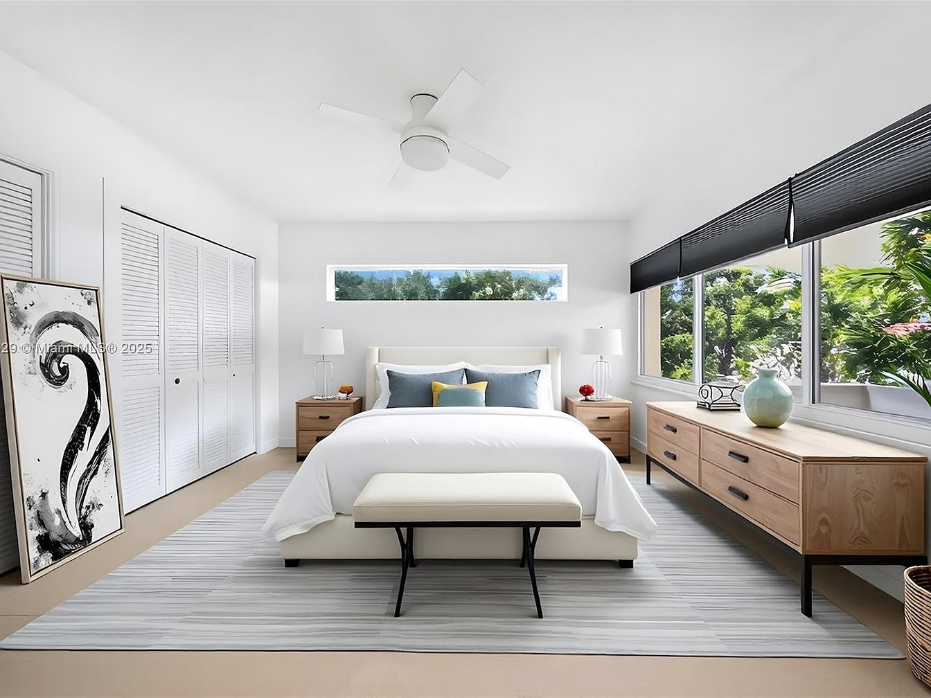 This space is a bright bedroom featuring a minimalist design. The walls are painted in crisp white, enhancing the airy feel. A large window allows ample natural light to flood the room, complementing the light-colored marble flooring that extends throughout. Opposite the window, a set of white louvered closet doors provides convenient storage. The room includes a ceiling fan, adding to its comfort. Distinctive architectural features include clean lines and simple moldings, contributing to the modern aesthetic. A glass-paneled door leads to another area, hinting at a functional and open layout within the home.