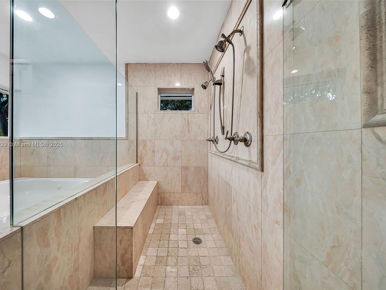 A contemporary bathroom featuring a spacious shower area with glass walls that enhance openness. The color palette consists of light beige and creamy tones, complemented by a natural stone bench and matching tiled flooring. Dual showerheads mounted on a stylish wall provide a luxurious experience. A soaking tub is positioned alongside a window, allowing natural light to flood the space while maintaining privacy. The minimalist design is accentuated by clean lines and sleek fixtures, creating a serene yet functional atmosphere. The subtle harmony of textures and colors promotes relaxation and a spa-like ambiance.