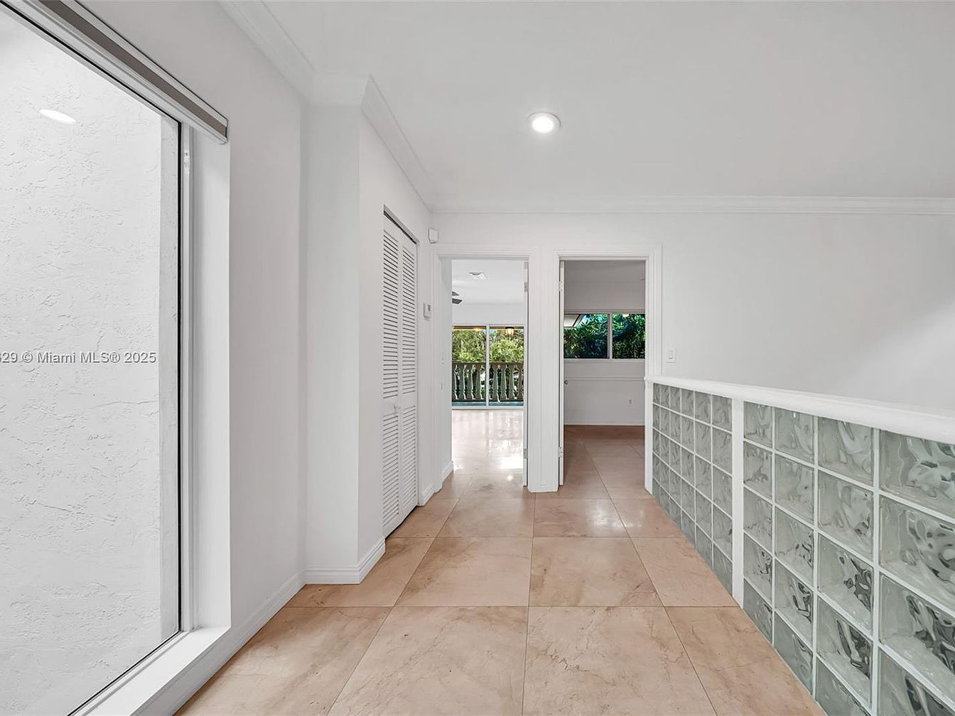A spacious hallway with clean lines and minimalist design features soft white walls and light-colored, polished tile flooring. Large windows allow natural light to flood the area, enhancing the airy atmosphere. To one side, a low glass block wall adds a touch of elegance while maintaining privacy. The lighting is subtle, highlighting the sleek architectural details, such as the crown molding along the ceiling. Closed doors lead to adjacent rooms, suggesting a functional layout. The overall color scheme is neutral, creating a serene environment that complements the modern aesthetic of the home.