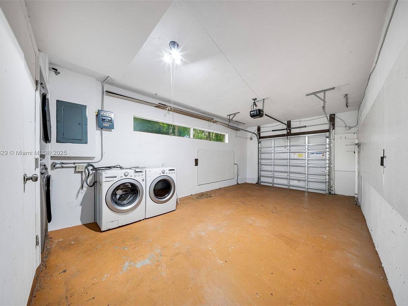 This garage features a functional layout with ample floor space, allowing for easy movement and storage. The walls are painted in a bright white, enhancing the luminosity of the area. Two modern, front-loading washing machines are aligned side by side, providing convenience for laundry tasks. The flooring is a sturdy, warm orange concrete, offering durability. Large garage doors lead outside, with additional natural light filtering in through a high-set window. The space includes utility features like an electrical panel and a well-organized storage area, alongside a ceiling-mounted light fixture that ensures visibility.