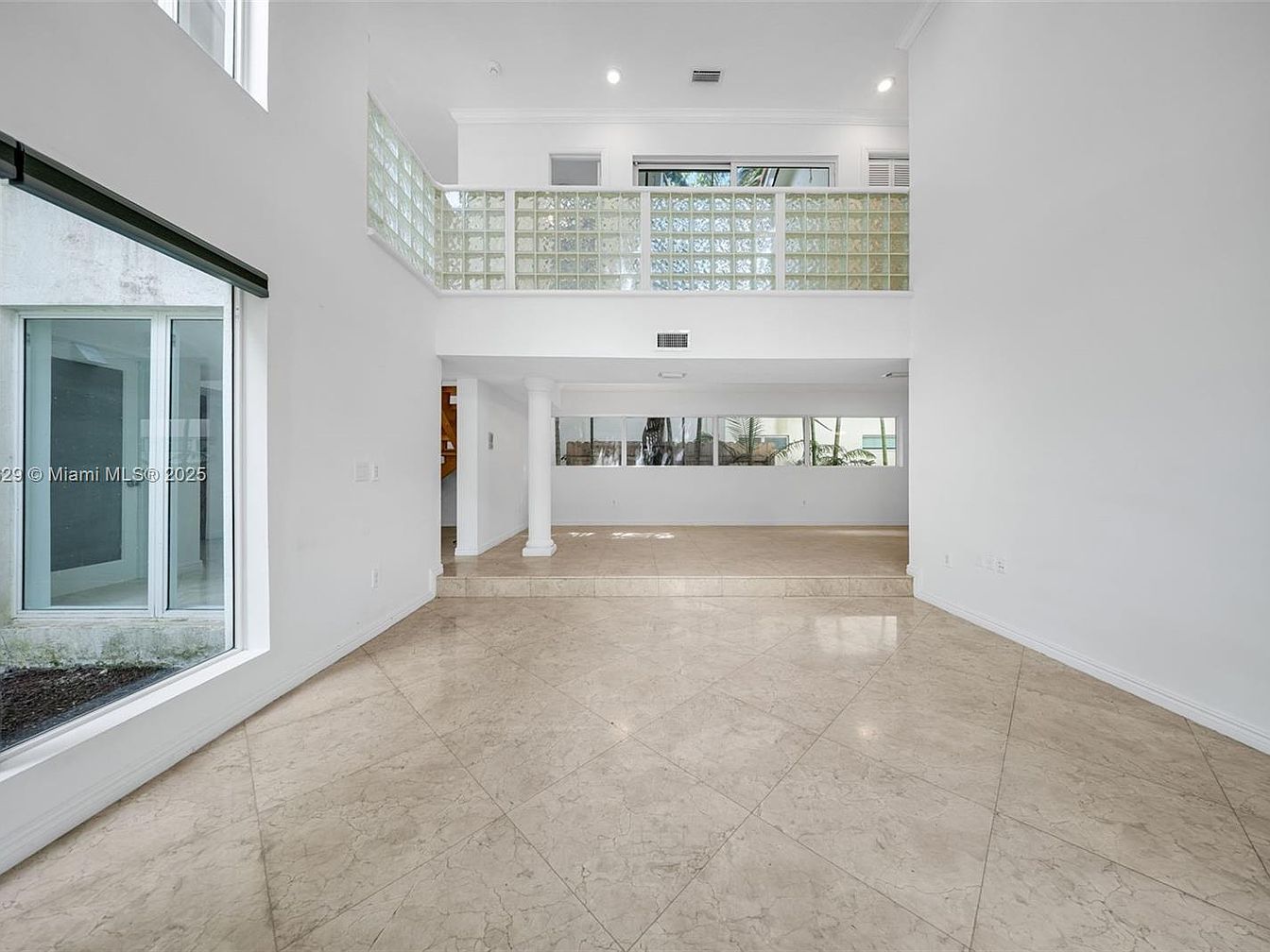 This spacious living room features a high ceiling that enhances its openness, with large glass block walls diffusing natural light. The polished marble floor adds a touch of elegance, exhibiting subtle veining. Clean white walls contribute to a minimalist aesthetic, creating a bright, airy atmosphere. A unique architectural column stands in the room, adding texture to the design. The layout allows for easy furniture arrangement, ideal for both casual gatherings and formal events. A wall of windows offers views of the outdoor space, blending indoor and outdoor living, enhancing the tranquil vibe.