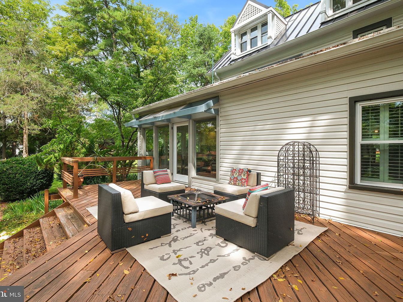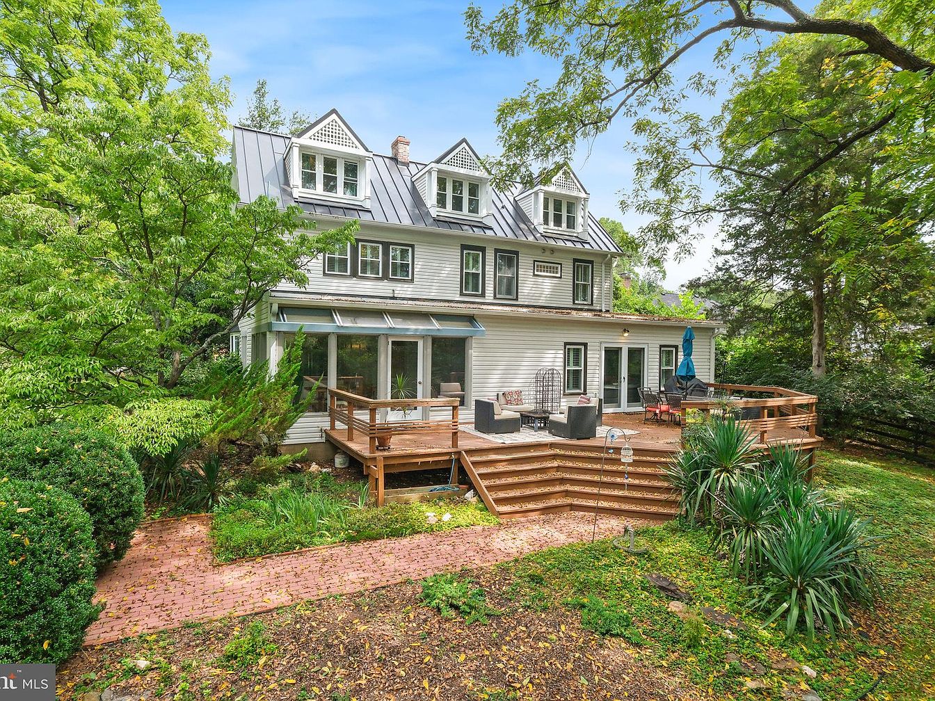 The image showcases a charming backyard deck attached to a historic home, surrounded by lush greenery. A wooden deck features a seating area with simple outdoor furniture and an umbrella, enhancing the outdoor atmosphere. The house itself is dressed in light-colored siding, with multiple windows allowing natural light to fill the interior. The sloped roof with metal accents adds architectural interest. Surrounding the deck, an array of vibrant plants and bushes create a serene and inviting environment, while a winding stone path leads visitors closer, suggesting a harmonious blend of nature and living space.
