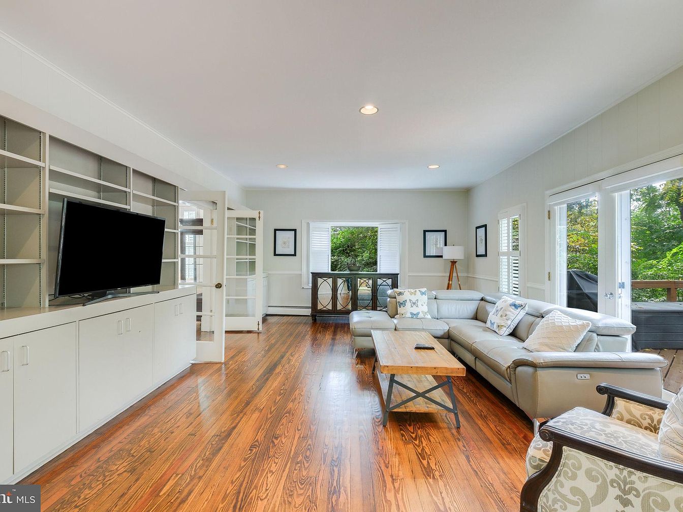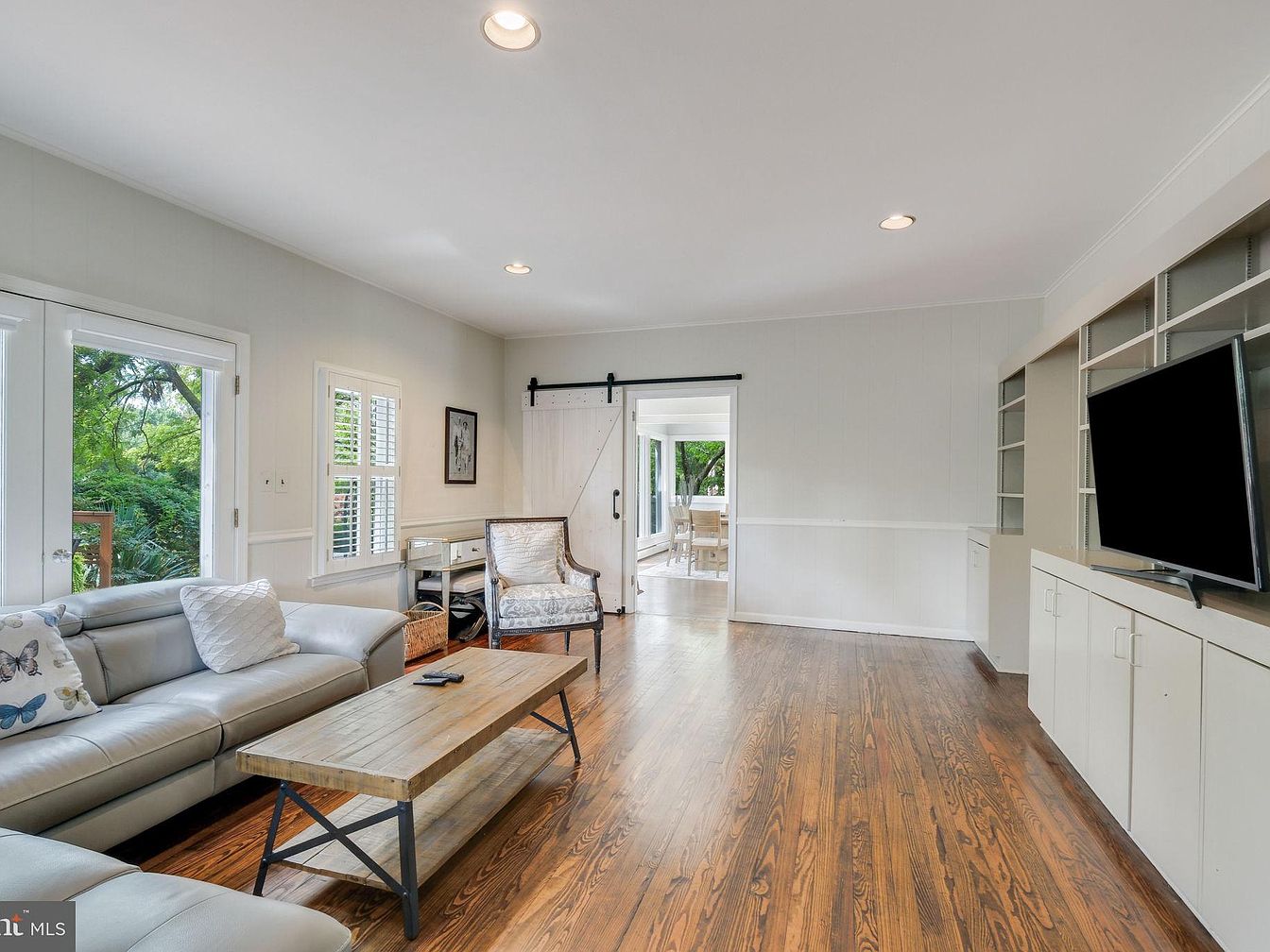 The living room features an inviting open layout, highlighting a blend of modern and traditional elements. A light gray leather sofa provides comfort, accompanied by a rustic wooden coffee table that boasts a minimalist metal frame. Natural light floods in through large windows, enhancing the warm, welcoming atmosphere. Light-colored walls contrast with rich, dark hardwood flooring, creating an elegant yet casual vibe. A wall-mounted television sits within built-in cabinetry, maximizing space efficiency. Decorative accents like a patterned armchair and subtle artwork add personality, while a sliding barn door promotes a seamless connection to adjacent spaces.
