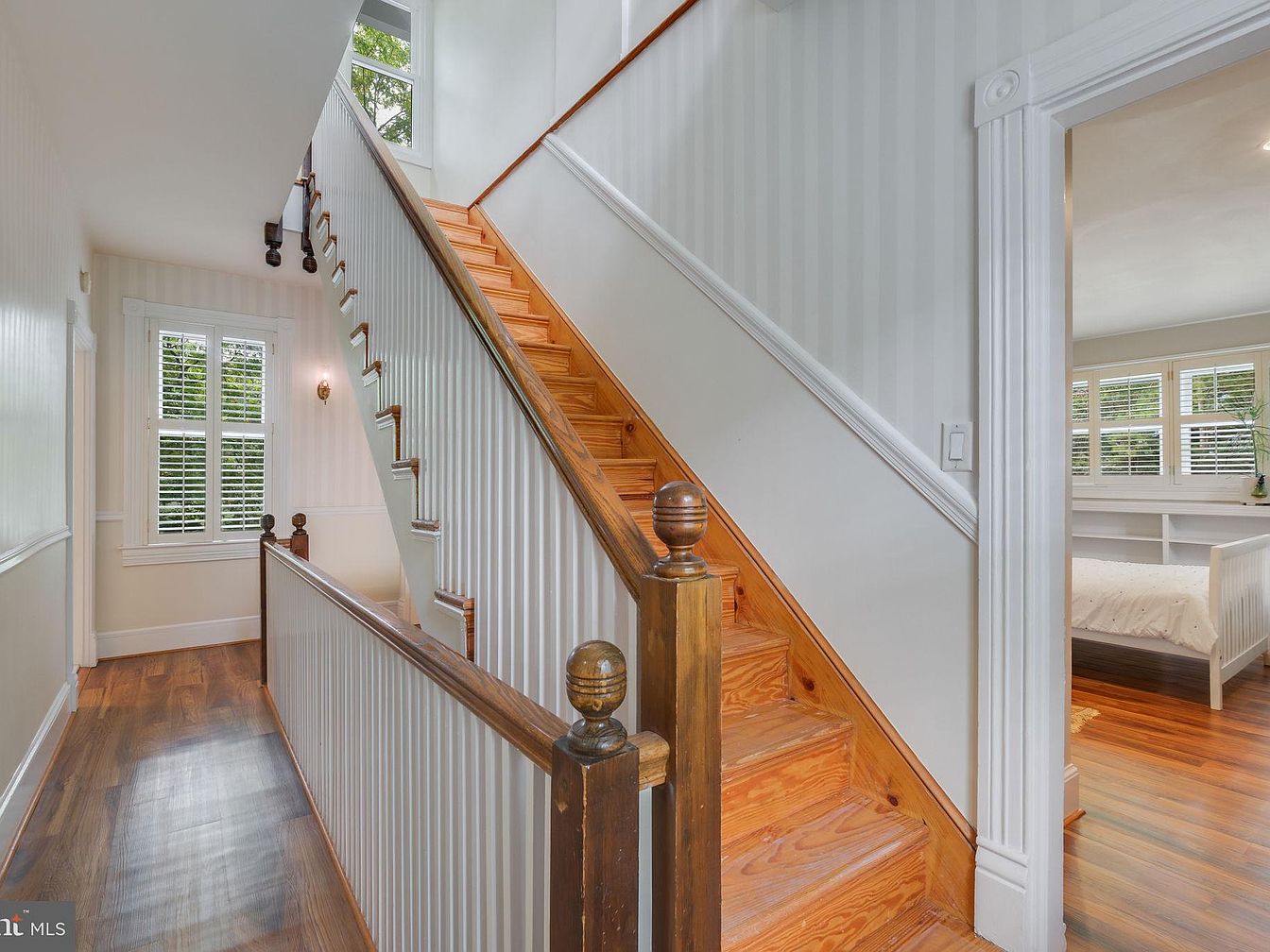 This entryway showcases a welcoming staircase with polished wooden steps leading to the upper level. The walls are adorned with subtle vertical stripes in soft beige, complementing the natural wood tones. A wooden handrail with rounded balusters frames the staircase, enhancing its classic charm. To the left, a window with white shutters allows natural light to flood the space, creating an airy ambiance. The rich hardwood flooring extends throughout, reflecting light beautifully. On the right, an open doorway offers a glimpse of a cozy bedroom, suggesting a perfect blend of traditional style and functionality.