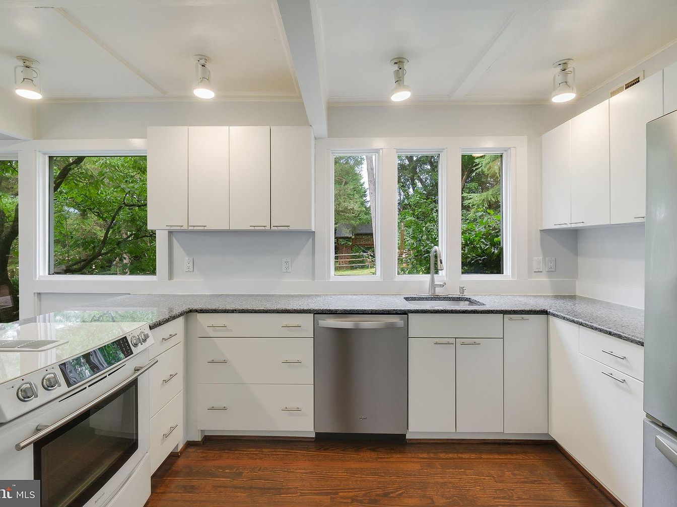The kitchen features a modern and minimalist design, characterized by sleek white cabinetry that complements the dark granite countertops. A spacious layout allows for ample movement, with a stainless steel sink positioned beneath large, well-lit windows that overlook greenery, enhancing the space with natural light. The cabinetry includes streamlined pulls, contributing to a clean aesthetic. Under-cabinet lighting highlights the countertop, while the polished hardwood floors add warmth and contrast to the predominantly white color scheme. An efficient gas range is positioned within easy reach, fostering a functional cooking environment, ideal for both casual meals and elaborate dinner preparations.