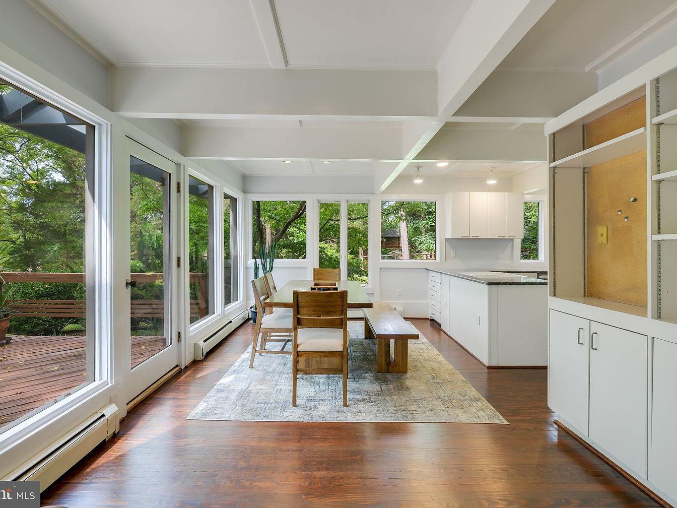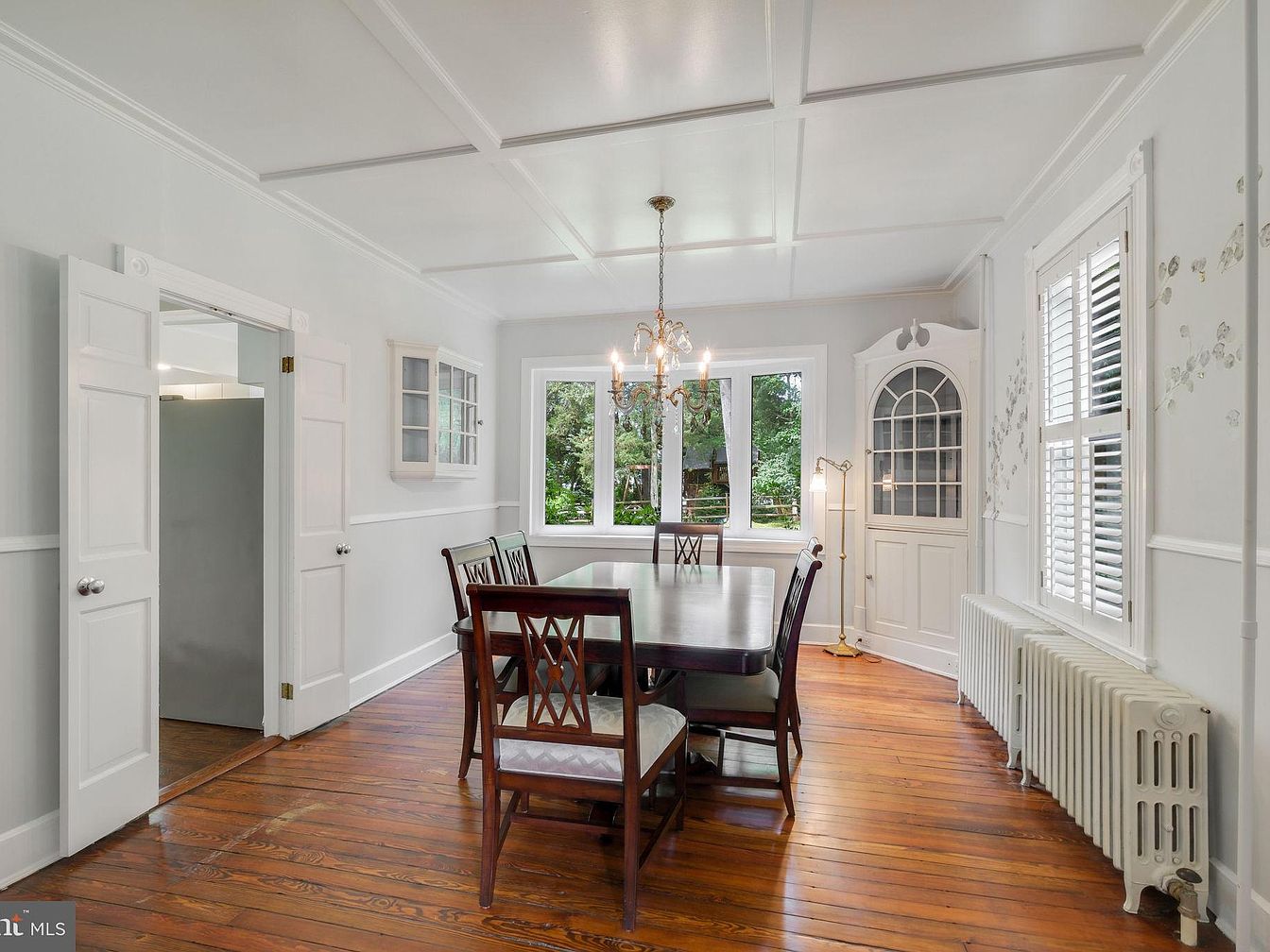 This dining room features a formal layout with a long wooden table surrounded by elegant chairs, creating a gathered yet refined atmosphere. Warm wooden floors contrast with the soft, light gray walls, while coffered ceilings add depth and sophistication. Natural light floods in through a series of windows, accented by white shutters, providing views of the lush garden outside. A charming chandelier hangs above the table, enhancing the area’s elegance. Built-in corner cabinets display decorative pieces, and a vintage radiator complements the room’s classic design, merging functionality with historic charm.