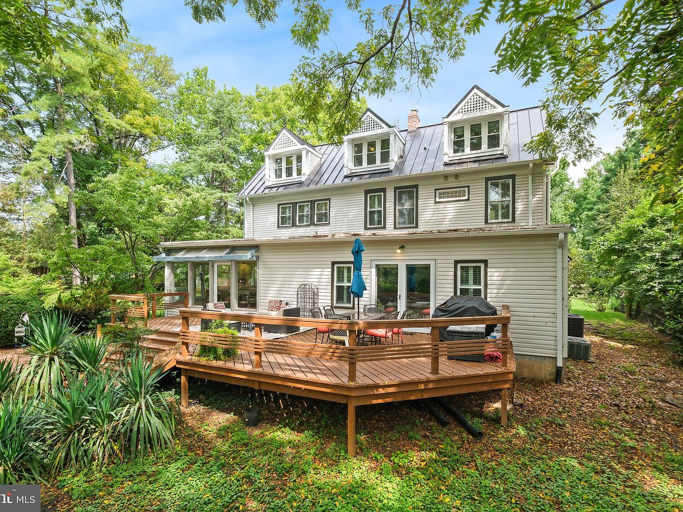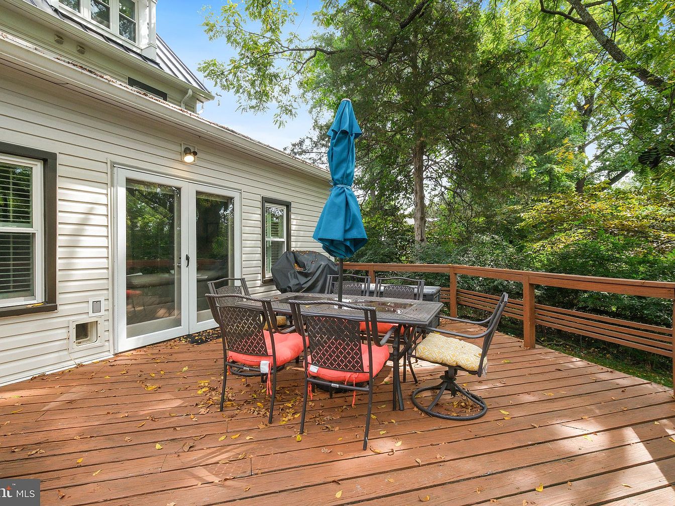 The image showcases a serene backyard deck of a historic home, framed by lush greenery. The deck features rich wooden planks, extending seamlessly from the house and adorned with a variety of potted plants. A vibrant blue umbrella provides shade over an outdoor dining area, which includes a dining table and chairs. The home’s exterior combines classic white siding with a multi-gabled roof, highlighting its architectural charm. Large glass doors invite natural light into the interior. The peaceful setting includes a backdrop of tall trees and gentle landscaping, creating an inviting outdoor retreat.