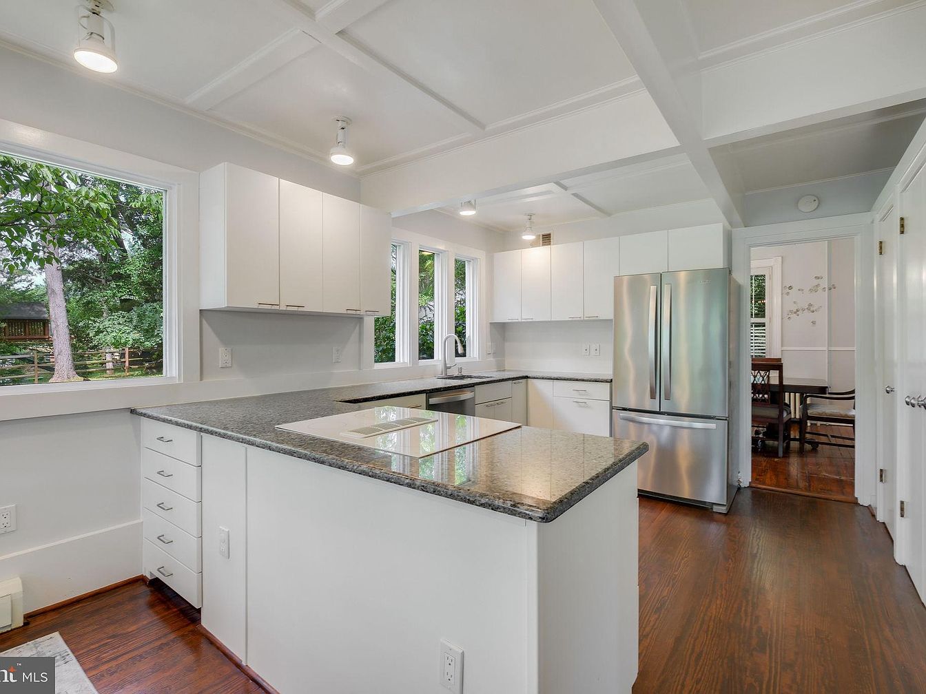 This modern kitchen combines functionality and style with a spacious layout. White cabinetry contrasts with the dark granite countertops, creating a fresh and airy feel. Large windows invite natural light, showcasing lush greenery outside. Sleek stainless steel appliances, including a double-door refrigerator, add a contemporary touch. The center island features an integrated cooktop, perfect for meal preparation and casual gatherings. A coffered ceiling enhances the structural interest, while polished wood floors contribute warmth. The adjacent dining area, partially visible through an open doorway, maintains the open concept, ensuring an inviting atmosphere for both cooking and entertaining.