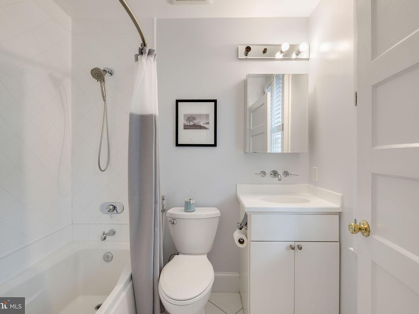 A modern bathroom featuring a clean, minimalist design. Soft gray hues on the shower curtain complement the white subway tiles, creating a serene ambiance. The layout includes a bathtub with a sleek chrome showerhead, alongside a compact white vanity with a round sink. Above the sink, a rectangular mirror sits under bright, modern light fixtures, enhancing illumination. A simple black and white framed photograph adds a touch of sophistication to the space. The floor is tiled in clean white squares, while a toilet is discreetly placed, ensuring efficient use of space. Overall, the design prioritizes functionality and elegance.