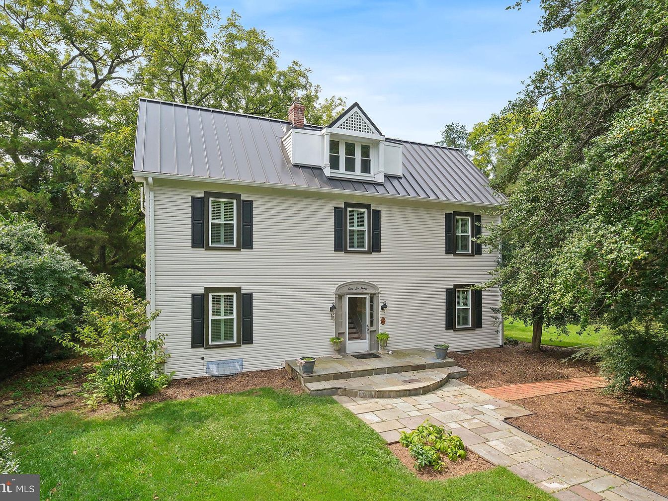 The front exterior showcases a charming historic home with a blend of classic and modern aesthetics. The house features a light-colored siding complemented by dark shutters, enhancing the traditional appeal. A metal roof adds a contemporary touch, while the symmetrical placement of windows creates visual harmony. The entryway is accentuated with a decorative archway, flanked by potted plants that add greenery. Stone pathways lead to the front steps, framed by well-maintained landscaping, including trimmed hedges and a vibrant lawn. This inviting facade suggests an atmosphere of warmth and timeless elegance, perfect for a family home.