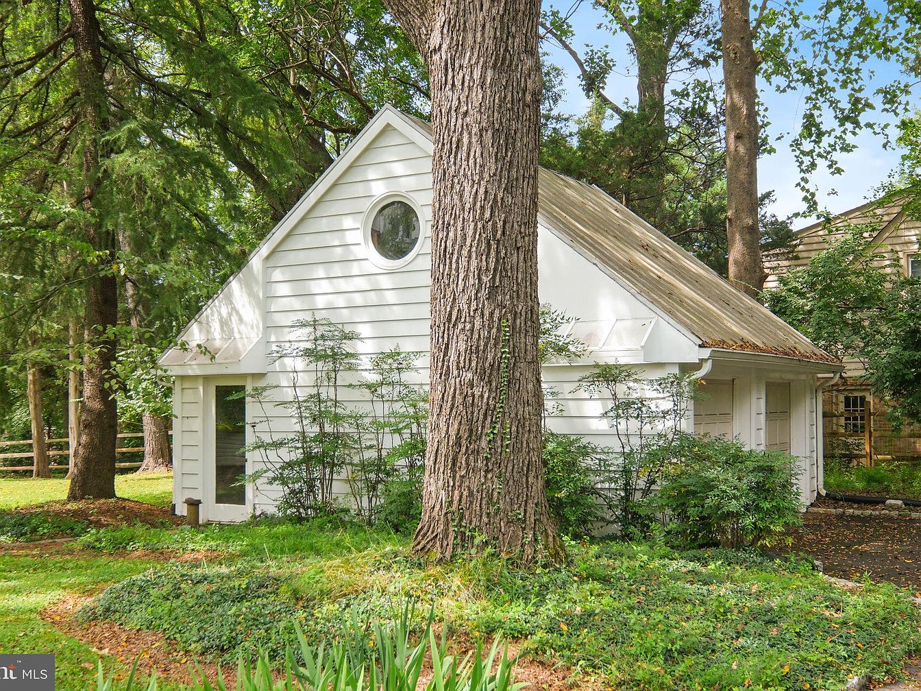 A quaint garden shed nestled among tall trees, featuring a classic white exterior that complements the lush greenery surrounding it. The shed’s angled roof and round window add charm and character. Dense foliage and well-maintained shrubs flank the structure, with hints of colorful flowers peeking through. The setting feels serene, framed by large tree trunks and dappled sunlight filtering through the leaves. A soft, grass-covered path leads to the door, inviting exploration. The overall aesthetic blends rustic simplicity with natural beauty, creating a peaceful retreat within a vibrant garden space.