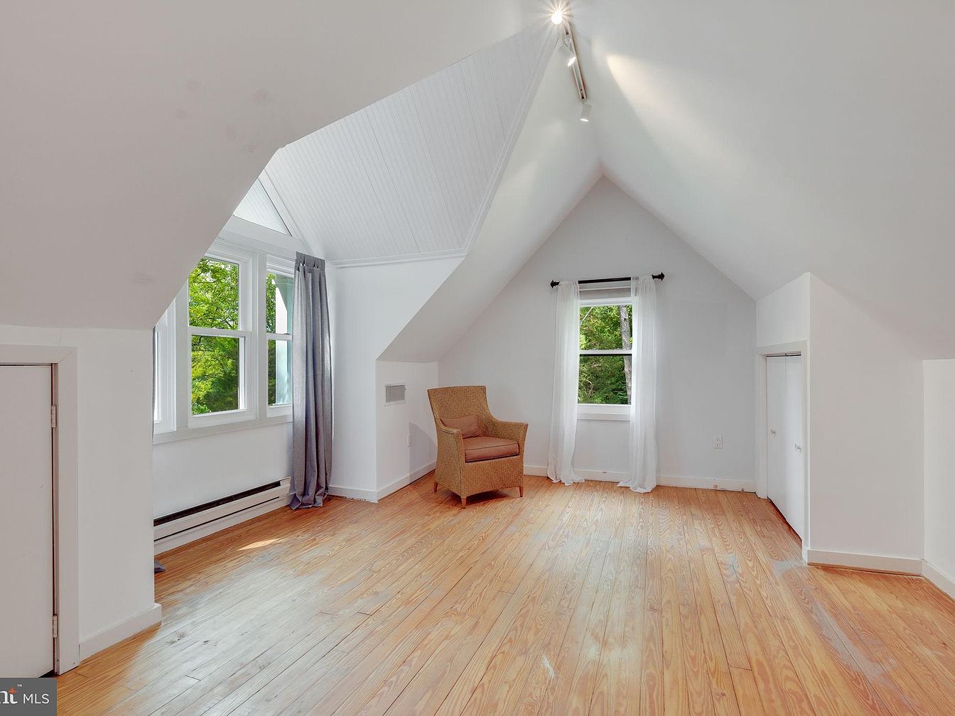 This airy attic space features a vaulted ceiling that sharply angles to create a cozy yet open atmosphere. Natural light floods in through multiple windows, enhancing the bright, white walls and slender wood trim. A stylish tan armchair offers a perfect reading nook, complemented by the warm hue of the polished wooden floorboards. Soft gray curtains frame the windows, adding a touch of elegance while contrasting with the light decor. Built-in closets provide practical storage solutions, maintaining the uncluttered feel. Overall, the design balances comfort and functionality, making it an inviting retreat.