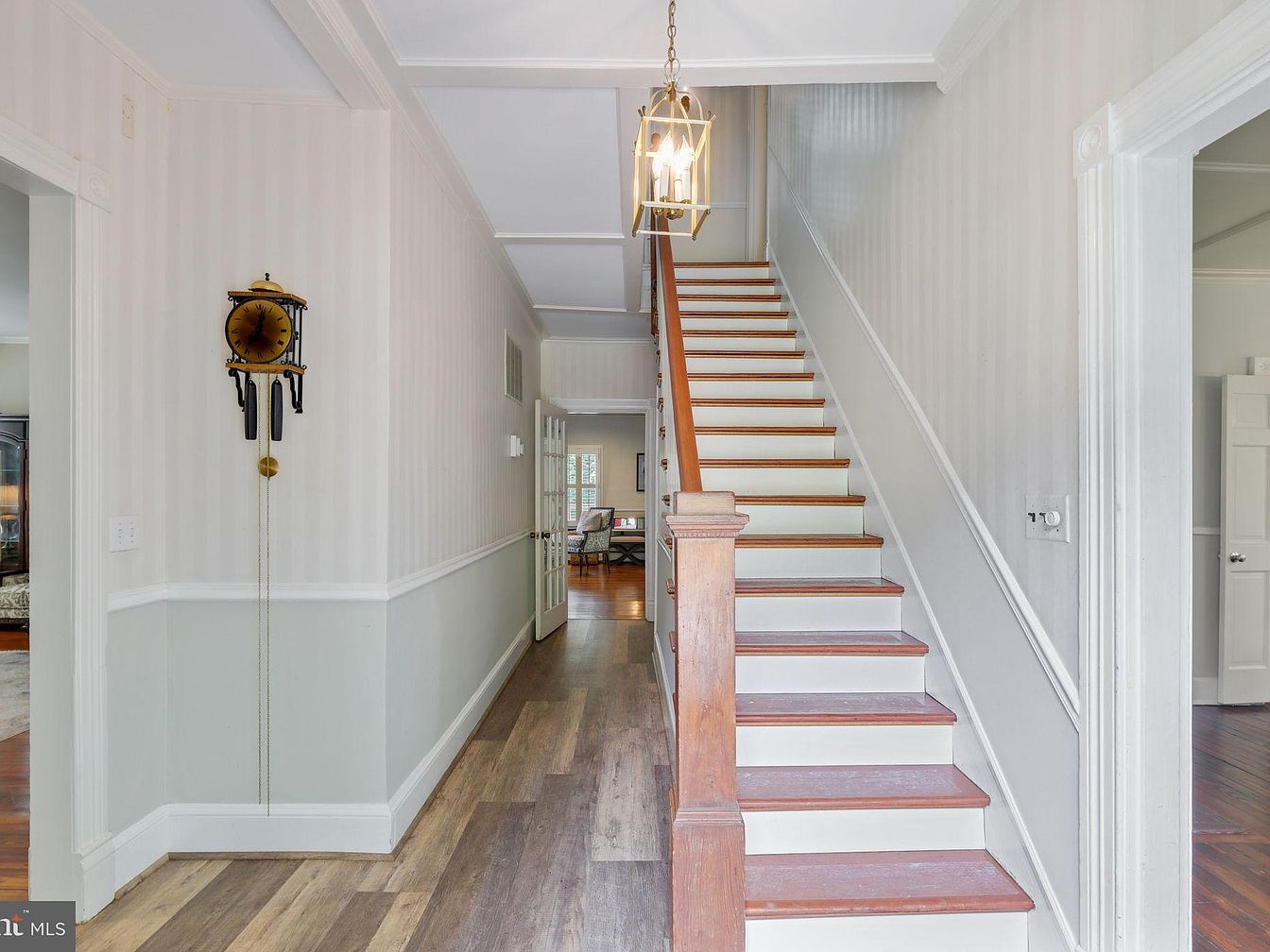 The entryway features a warm and inviting design, characterized by a blend of classic and contemporary elements. A striking wooden staircase with white risers complements the rich textures of the floor, which displays a natural wood finish. Soft, pale striped wallpaper adds an elegant touch, while wainscoting introduces a subtle contrast with soft gray. An antique wall clock hangs prominently, adding a nostalgic charm. A lantern-style light fixture hangs from the ceiling, illuminating the space with a gentle glow. The overall aesthetic exudes a balance of sophistication and comfort, inviting guests into the heart of the home.