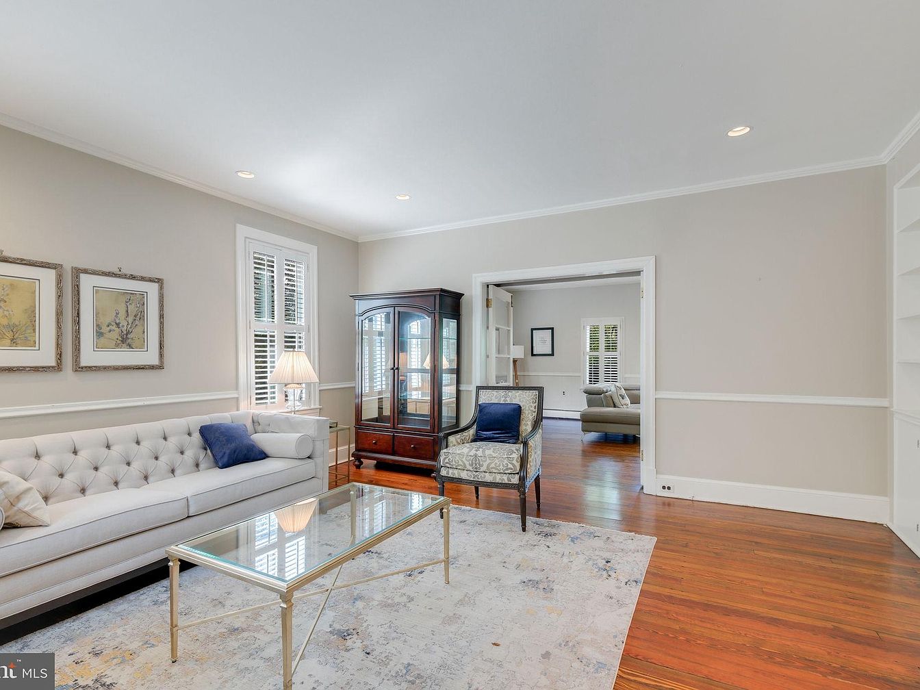 The living room features a cozy layout with a light beige color scheme enhanced by white trim and moldings. A tufted, cream-colored sofa occupies one side, complemented by a blue decorative pillow. To the right, an intricately designed armchair offers a touch of elegance. A glass-topped coffee table rests on a patterned area rug, contributing to the space’s charm. Opposite the sofa, a wooden display cabinet showcases antique decor. Windows with white shutters allow natural light to fill the room, highlighting the warm wooden flooring and creating an inviting atmosphere for relaxation and conversation.