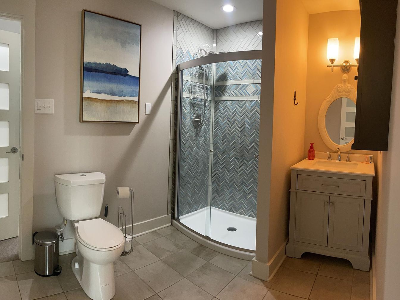 This modern bathroom features a sleek design with a neutral color palette of soft beige walls and contrasting gray tiled flooring. A circular mirror above the vanity enhances the elegance of the space, complemented by contemporary lighting fixtures. The vanity, in a light gray finish, offers clean lines and ample storage. A glass-enclosed shower at the back, with a stylish herringbone tile pattern, serves as a focal point. A white toilet is positioned neatly beside a small trash can, ensuring functionality. An abstract artwork hangs above, adding a touch of sophistication and warmth to this functional yet stylish retreat.