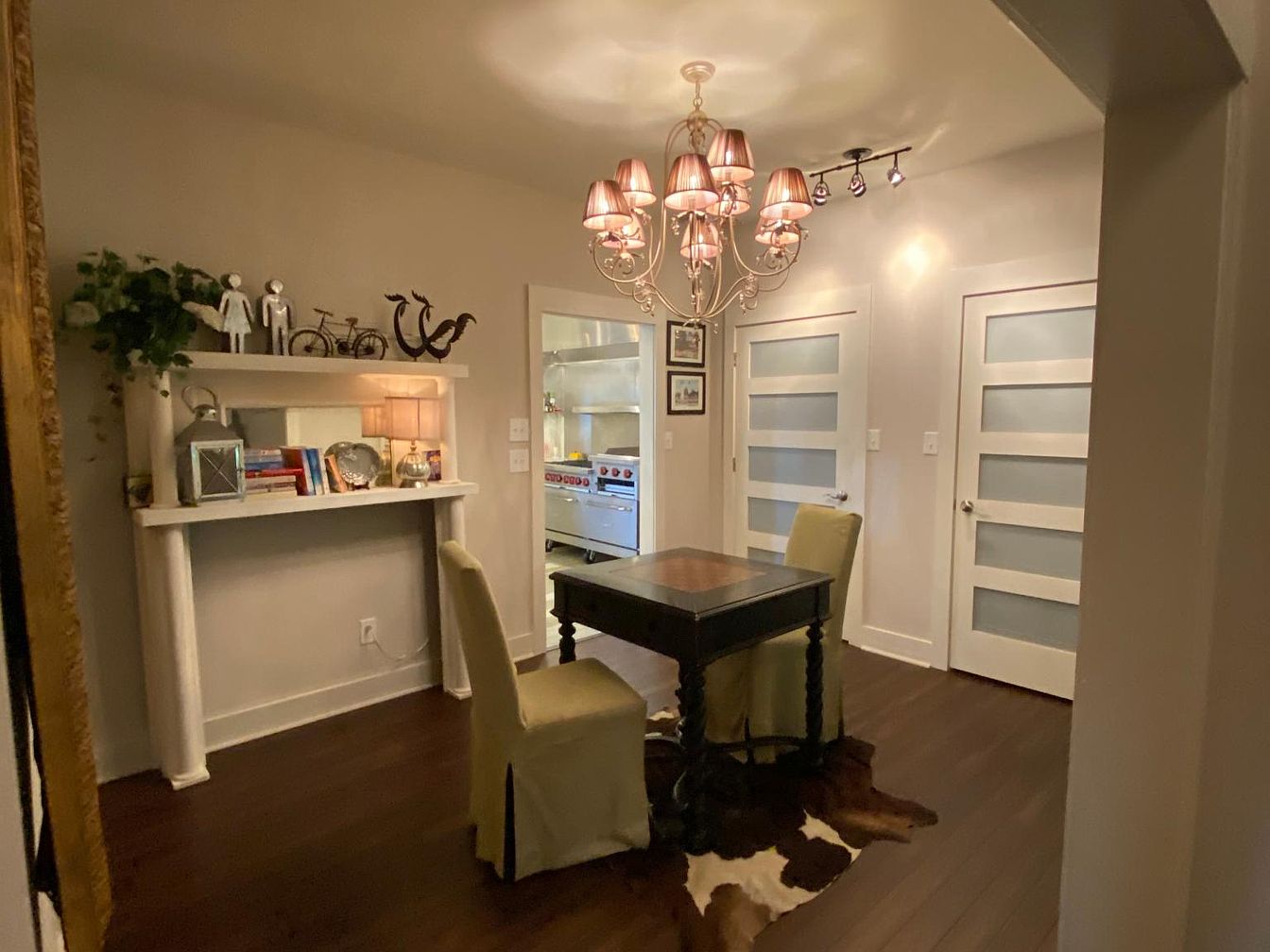 A charming dining area showcases a refined blend of modern and vintage styles. Soft beige walls enhance the warm atmosphere, complemented by rich brown hardwood flooring. A stylish chandelier with soft pink shades illuminates a dark wooden table, surrounded by two upholstered chairs in a muted green fabric. An open shelving unit elegantly displays decor items, such as small sculptures, books, and a lantern, adding personality to the space. Double doors with frosted glass provide a glimpse into the adjacent kitchen, creating a seamless flow. Decorative accents and thoughtful lighting elevate the inviting ambiance.