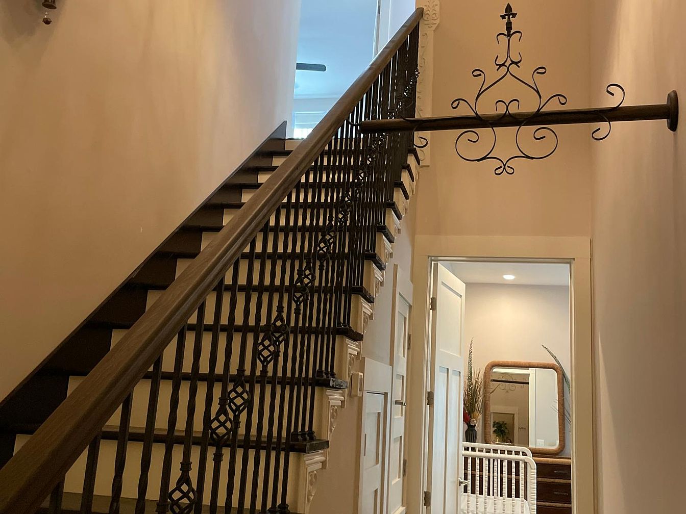 A refined staircase leads upward, featuring dark wood steps and ornate black wrought iron railings that add elegance. The staircase is framed by soft, neutral wall tones enhancing the inviting feel. To the right, an expansive doorway reveals a glimpse of a well-decorated room with natural light. A large, decorative mirror hangs on the wall, reflecting subtle decorative elements, including a plant arrangement. Architectural details like the molding above the door add character, while the simple chandelier fixture maintains a classic ambiance. This entryway effectively combines traditional design with modern touches, creating a warm atmosphere.