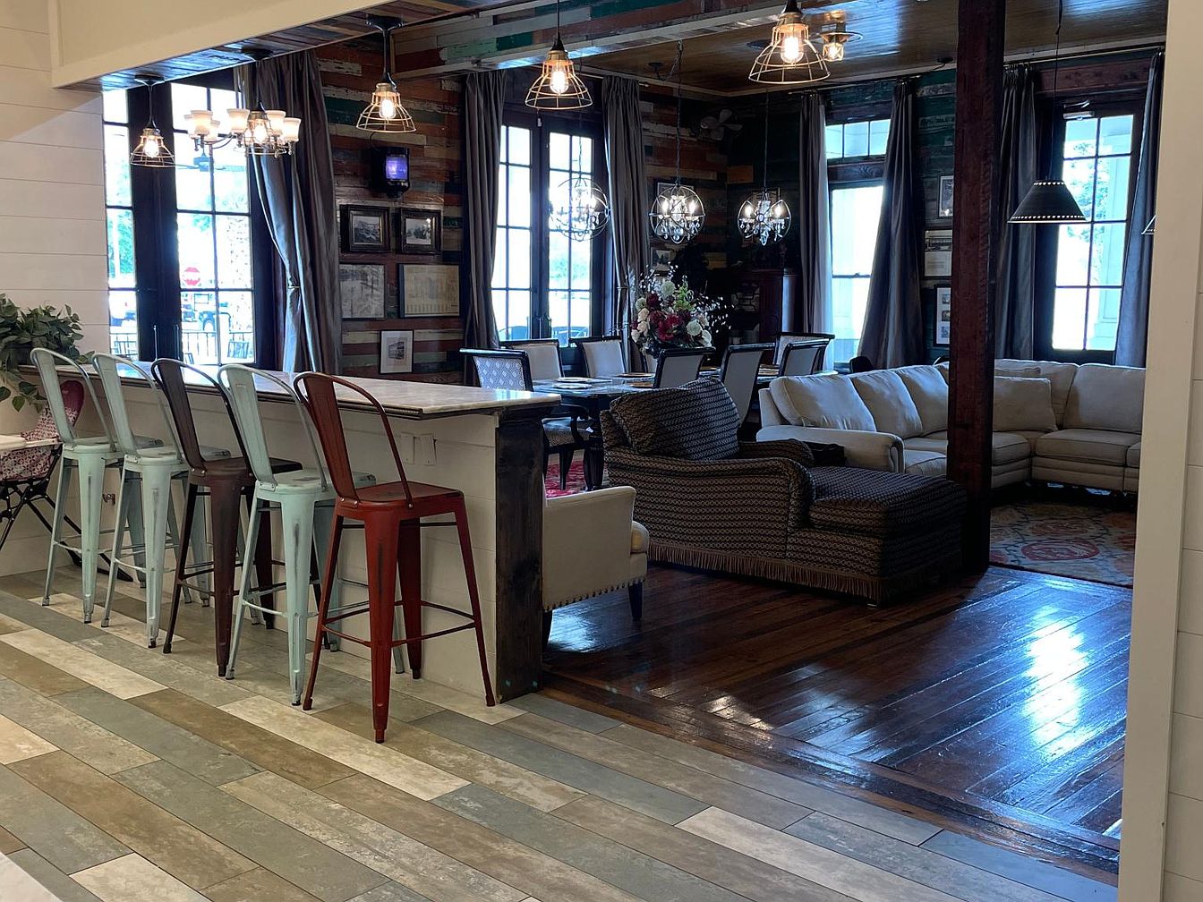 This open concept space combines a casual dining area and living room. A long kitchen island features sleek metal bar stools in varying colors—red, mint, and silver. The flooring showcases a unique blend of wide wooden planks in earthy tones, emphasizing the rustic charm. Tall windows adorned with elegant drapes allow natural light, illuminating the rich textures of the wooden walls. A cozy sectional couch in a soft cream hue invites relaxation, paired with a patterned accent chair. Decorative elements include stylish pendant lights and framed artwork, enhancing the inviting ambiance of this historic home.