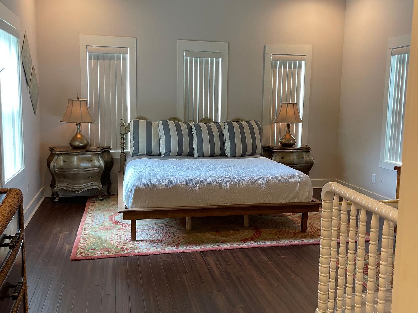 This spacious bedroom features a beautifully minimalist design. The focal point is a low-profile wooden bed, styled with crisp white bedding and adorned with plush, striped cushions in shades of gray and white. Flanking the bed are two elegant lamps, each resting on ornate side tables with a metallic finish. The room is illuminated by natural light streaming through three tall windows framed by sleek white trims, while a rich wood floor adds warmth and texture. A colorful area rug intersperses a harmonious blend of reds, pinks, and intricate patterns, enhancing the room’s inviting atmosphere.