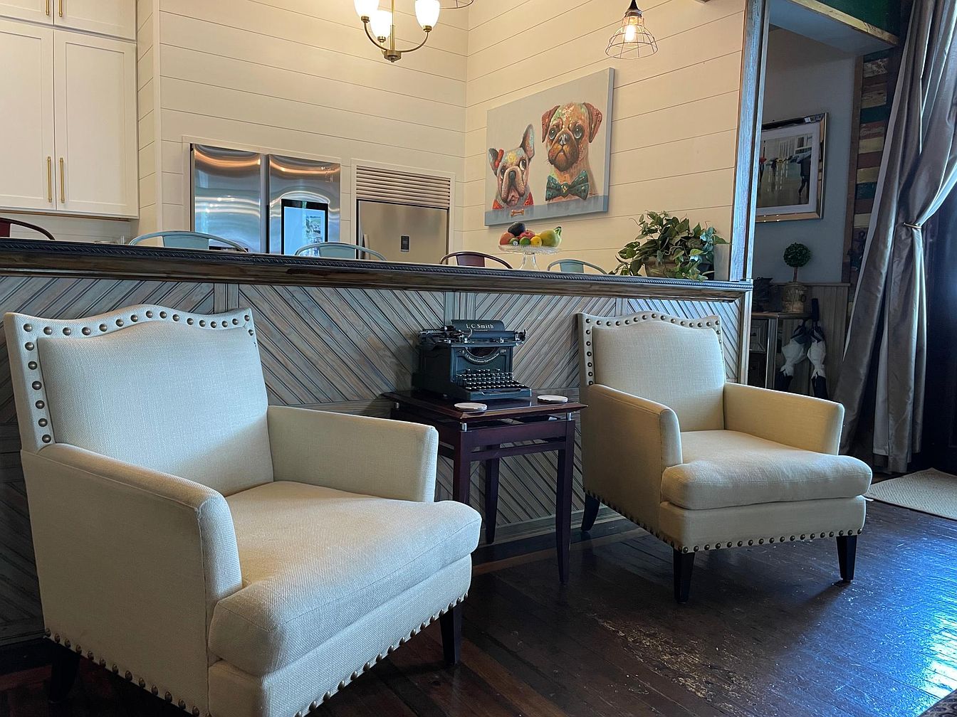 This living room area features two cream-colored armchairs with decorative nailhead trim, positioned for comfort. The chairs sit on rich, dark hardwood flooring, enhancing the warm atmosphere. A small wooden side table holds an antique typewriter, adding a vintage touch. Behind the chairs, a bar-style counter separates the space from the kitchen, highlighted by geometric wood paneling. Above the counter, soft pendant lights provide gentle illumination. A vibrant artwork of playful dogs hangs on the wall, adding color and character. Plush curtains frame a window, inviting natural light to fill the inviting, cozy setting.