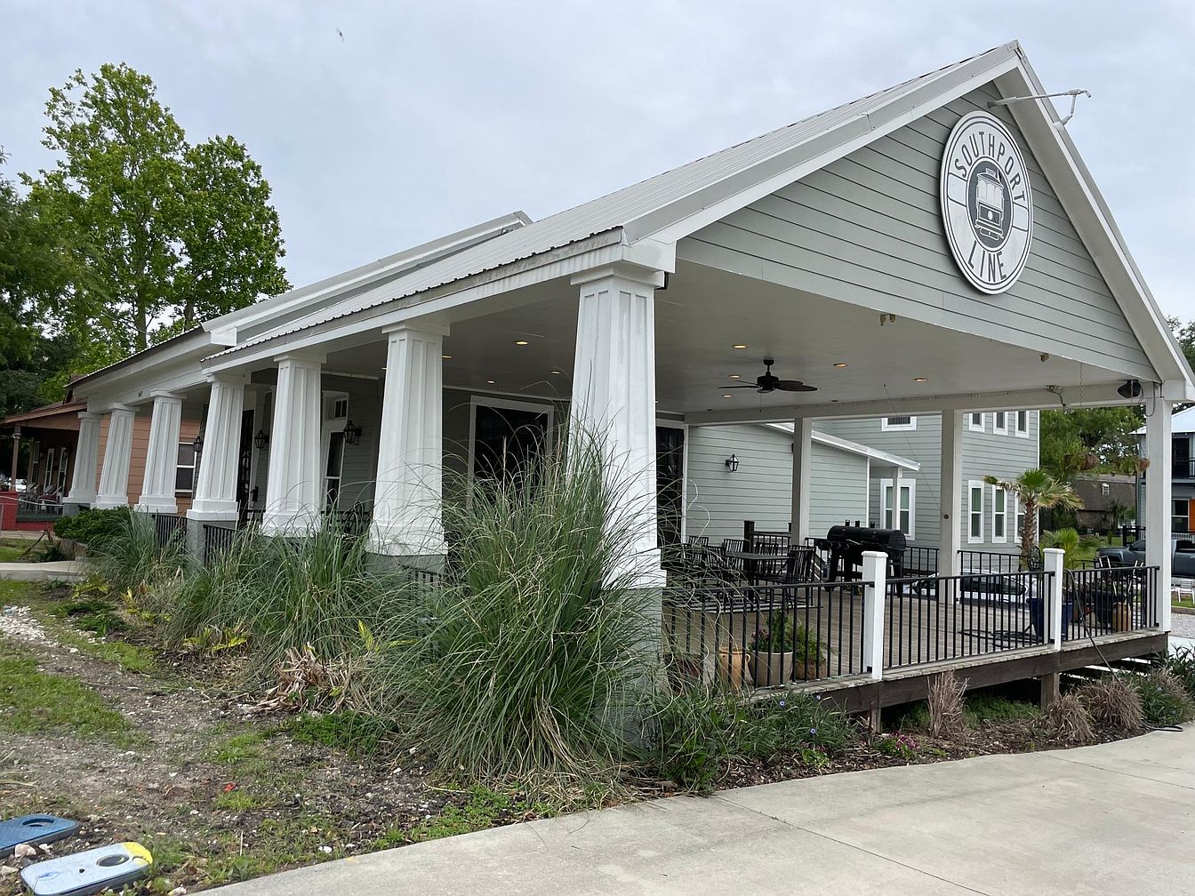 This image highlights the exterior of a stunning front porch. The space features classic white columns supporting a wide, sloped roof, creating a welcoming entrance. Soft gray siding complements the light, neutral tones of the structure. A circular sign with ‘Southport Line’ prominently displayed adds character. The porch is adorned with comfortable black metal furniture, inviting relaxation. Lush landscaping surrounds the area, with tall grasses and colorful plants enhancing the aesthetic. The polished concrete floor provides a sturdy base, while the overhead ceiling fans promise comfort on warm days. Overall, the design exudes a blend of traditional charm and modern comfort.