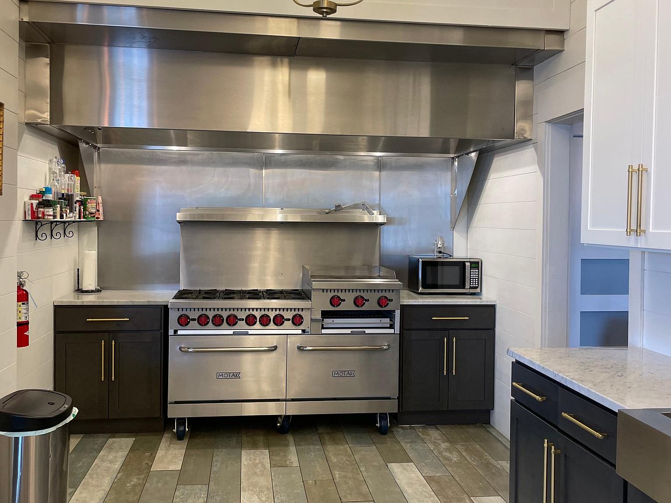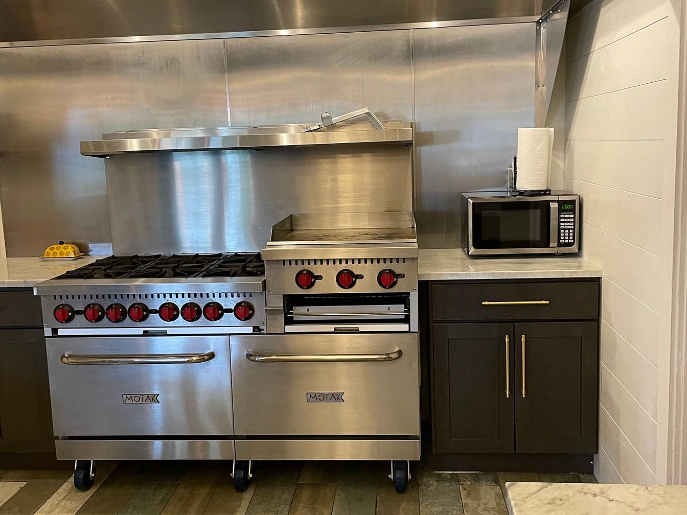 The kitchen features a professional-grade stainless steel range with six gas burners, each equipped with red knobs for easy control. Above the range, a sleek metal backsplash adds a modern touch, enhancing the room’s functionality. A double oven is integrated into the unit, providing versatile cooking options. To the side, a compact microwave is placed on a pale marble countertop, alongside a roll of paper towels for convenience. Dark cabinetry below contrasts beautifully with the light countertops, while brass handles add a touch of elegance. The overall aesthetic is a blend of contemporary design and industrial charm.