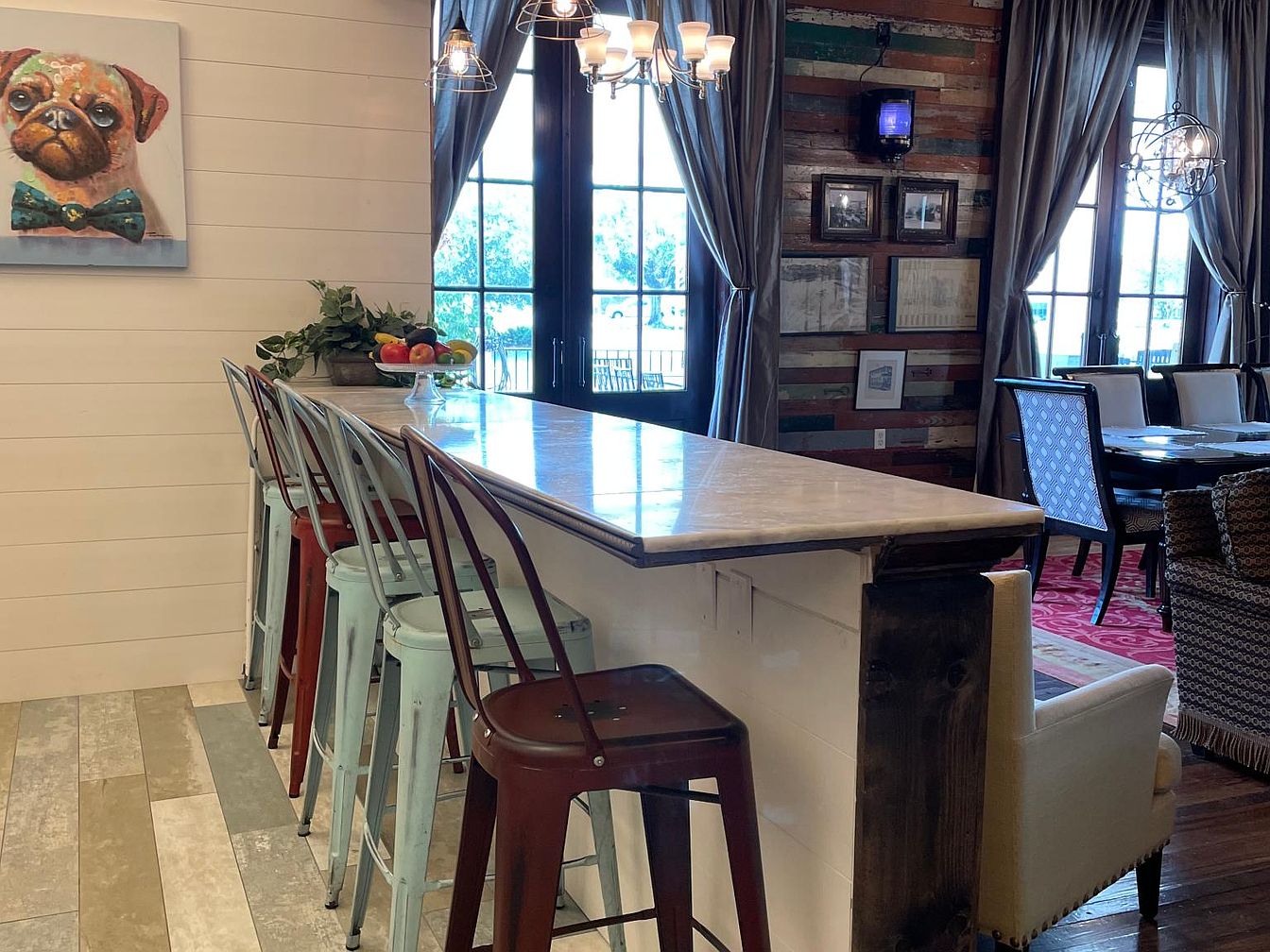 A modern kitchen bar showcases a long white countertop with a wooden edge, accompanied by stylish metal stools in muted colors of teal, red, and silver. The backdrop features a vibrant artwork of a dog adorned with a bowtie, adding a whimsical touch. Dark wood accents contrast with the white shiplap walls, while large windows draped in rich, dark curtains invite natural light. A rustic, multi-colored wood panel wall adds texture and warmth to the space. Adjacent, a dining area with upholstered chairs offers a cozy atmosphere, enhanced by warm lighting from hanging fixtures and a decorative bowl of fresh fruit.