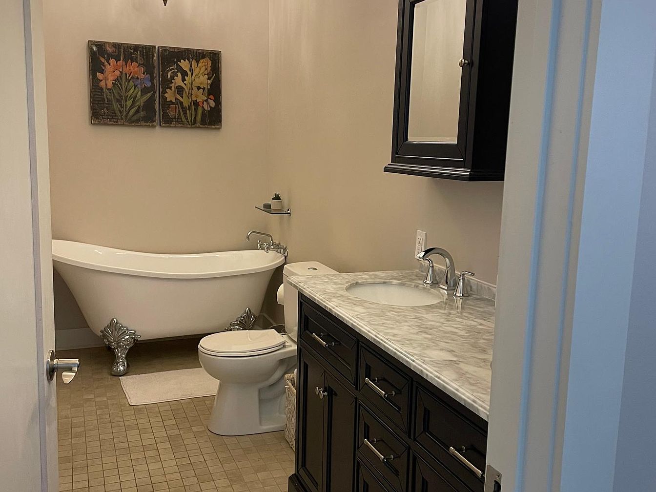 This elegant bathroom features a blend of modern and vintage aesthetics. A freestanding white clawfoot tub with ornate silver feet complements the neutral beige walls. Dual sinks with marble countertops and a dark wood vanity create a polished look. Above the sinks, mirrored cabinets add functionality and style. Contemporary light fixtures hang from the ceiling, providing soft illumination. Floral artwork in muted tones enhances the visual appeal, while a delicate vase with flowers adds a touch of color. The space is balanced with tile flooring that harmonizes with the overall soft and inviting atmosphere.