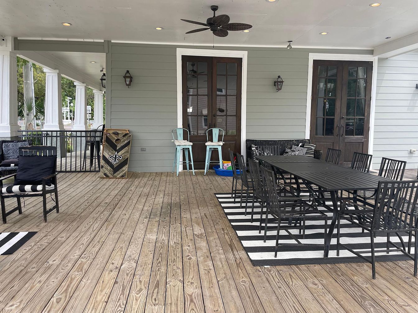 This spacious outdoor patio features a wooden floor with a natural finish, enhancing its rustic charm. Black metal dining furniture with sleek lines occupies the central area, paired with a contrasting striped rug that adds a playful touch. Two turquoise chairs add a pop of color against the muted gray siding of the house. Decorative lanterns and dual French doors with glass panes provide architectural interest and complement the home’s historic style. A comfortable lounge area with black wicker seating and a striped cushion invites relaxation, while a ceiling fan overhead offers a breeze, creating a welcoming atmosphere.