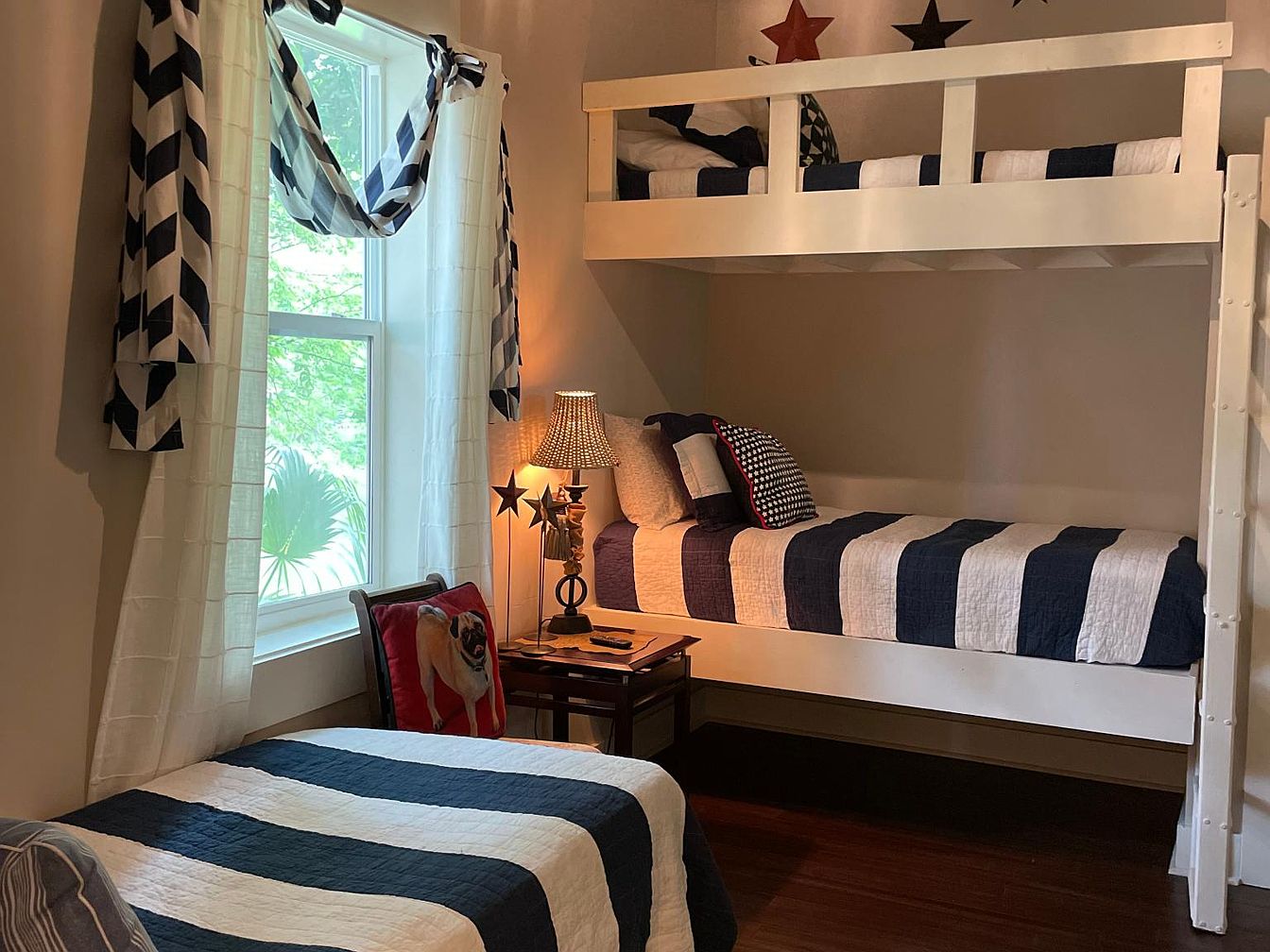 The image shows a cozy children’s bedroom featuring a bunk bed with a lower bed positioned next to a window. The bedding is styled with navy blue and white stripes, complemented by decorative pillows, including one with a playful dog design. Light-filtering white curtains are tied with patterned navy and white fabric, enhancing the lightness of the room. A bedside table holds a charming lamp, casting a warm glow. The walls are adorned with red and black stars, adding a whimsical element. The wooden floor adds warmth, creating a welcoming and playful atmosphere for children.