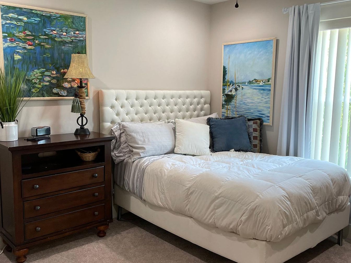 This cozy bedroom features a light and airy aesthetic with a plush bed centered against a soft, neutral wall. The headboard is upholstered in white tufted fabric, offering a touch of elegance. A matching white comforter covers the bed, complemented by various decorative pillows in soft blues and whites. To the side, a dark wood dresser with three drawers adds warmth and contrast to the room, topped with a stylish lamp and a small plant. Two paintings adorn the walls, showcasing vibrant water lilies and a serene waterscape, enhancing the tranquil atmosphere. Floor-to-ceiling window treatments in light fabric allow natural light to filter in.