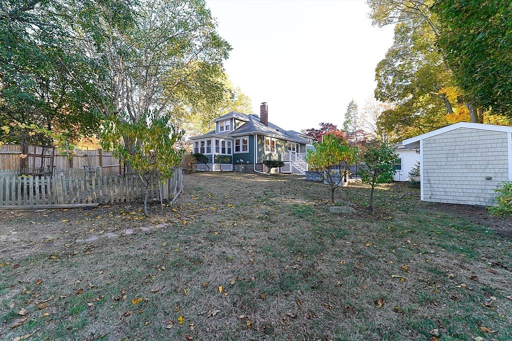 A wide, gently sloping backyard bordered by mature trees, a weathered wooden picket fence to the left, and a freestanding outbuilding or shed to the right. The home itself features a dark exterior with white trim, a gabled roof, and a sunroom or porch with large windows. The lawn is mostly dry with scattered patches of fall leaves, and small trees and shrubs are spaced throughout. Sunlight filters through the trees, creating a warm and peaceful atmosphere with a blend of natural wood tones, green foliage, and the blue-gray color of the house.