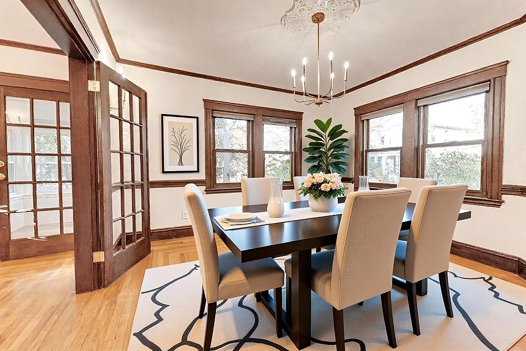 A rectangular dining room features a large dark wood table surrounded by six upholstered beige chairs on a cream area rug with a bold, curved black pattern. Three wide windows fill the space with natural light, accentuated by rich wooden trim that continues as a chair rail around the walls. The hardwood floor adds to the warm ambiance, complemented by a simple potted plant and a floral centerpiece. A modern, gold-toned chandelier with multiple candle-shaped bulbs hangs from an ornate ceiling medallion. French doors with glass panels open to an adjoining room, enhancing the classic yet inviting ambiance.