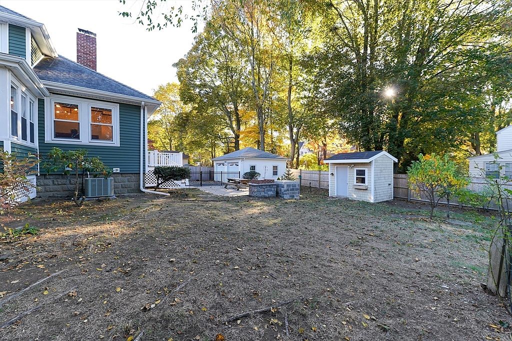 A spacious backyard bordered by a tall wooden fence is framed by mature trees, their autumn leaves filtering sunlight onto the ground below. To the left, the corner of a historic home with teal siding, white trim, and a stone foundation is visible, featuring several double-hung windows. Near the center, a paved patio area with a low stone fire pit and seating area is set near a detached white garage. To the right, a small white shed with a dark roof sits near patches of young trees and shrubs. The overall feel is peaceful and open, ideal for outdoor relaxation.