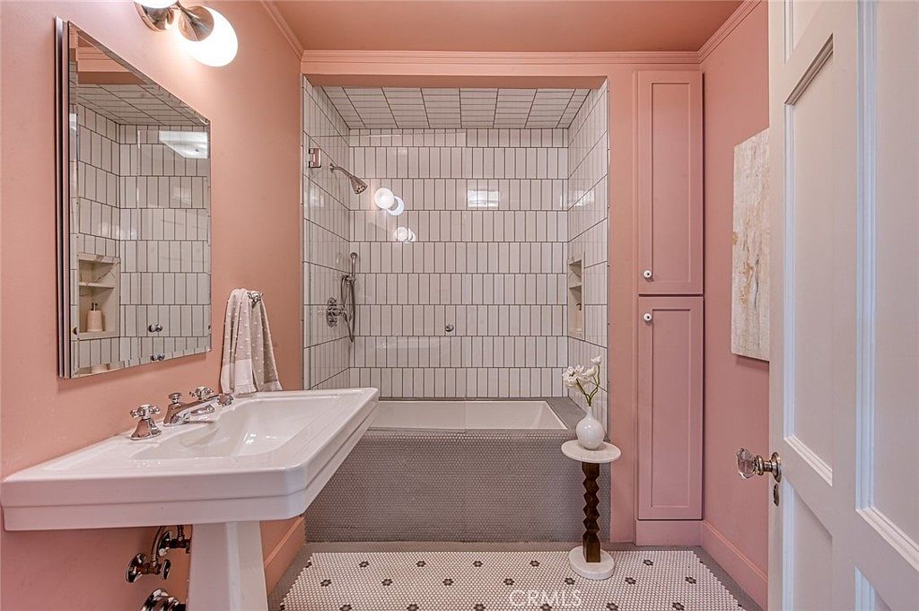 A charming bathroom features blush pink walls and cabinetry, creating a soft, vintage-inspired ambiance. The bathtub is enclosed within a white subway tile alcove, with the tiles set vertically to add visual interest. A pedestal sink with traditional chrome fixtures stands below a large, framed mirror. The floor is finished with small hexagonal white tiles accented by small black dots. A modern sconce light above the mirror provides bright illumination. A small round table beside the tub displays a simple white vase holding delicate flowers, adding a fresh touch to the space’s warm and inviting color palette.