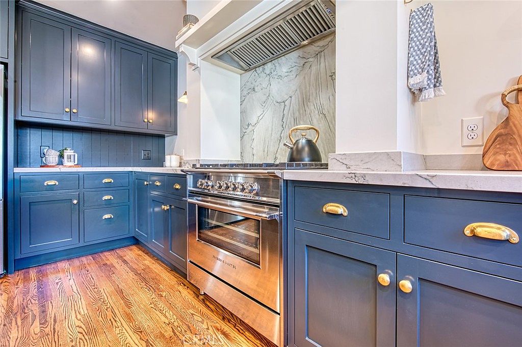 A compact and elegant kitchen corner features navy blue cabinetry with brass pulls and knobs, creating a classic yet bold color scheme. The countertops are marbled, echoing the sophisticated look of the backsplash behind the stainless steel range. Warm hardwood floors provide a rich and inviting contrast to the blue cabinets. On the counters, a teakettle sits atop the stove, while a cutting board, towel, and a few small containers add practical details. Brass hardware and simple cabinet paneling add historic charm, blending traditional elements with modern touches in clean, crisp lines.