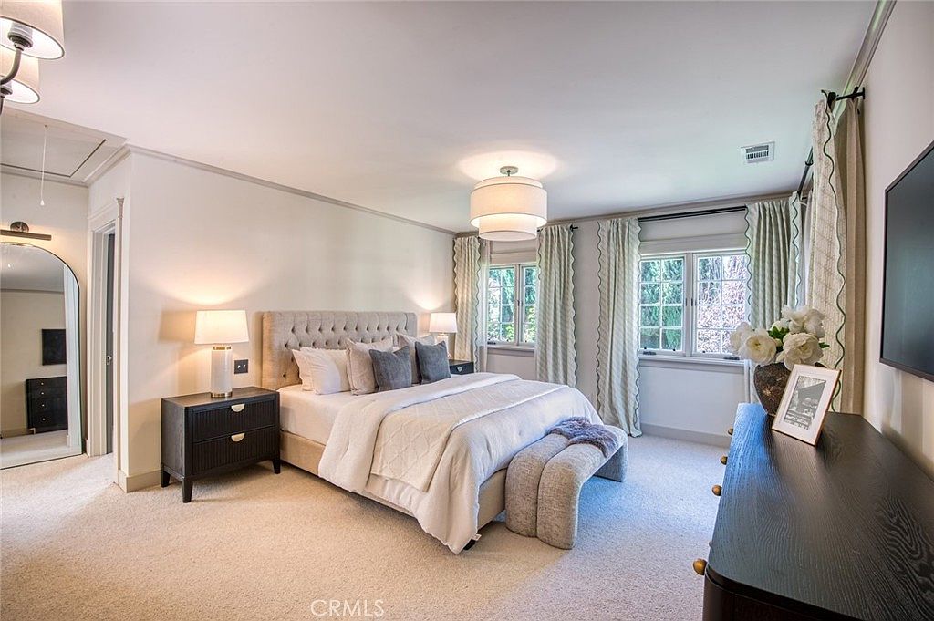 A spacious bedroom with a neutral color palette of soft creams and light grays fills the scene. The plush, tufted headboard and neatly arranged pillows create an inviting bed, layered with blankets and throws. Matching black wood nightstands flank the bed, each topped with a modern lamp and coordinated decor. Large windows with cream and sage drapes allow natural light to brighten the room. Opposite the bed, a sleek dresser displays fresh flowers and a framed photograph. An arched mirror in the corner expands the sense of space, while subtle recessed lighting and a central ceiling fixture enhance the gentle, serene ambiance.