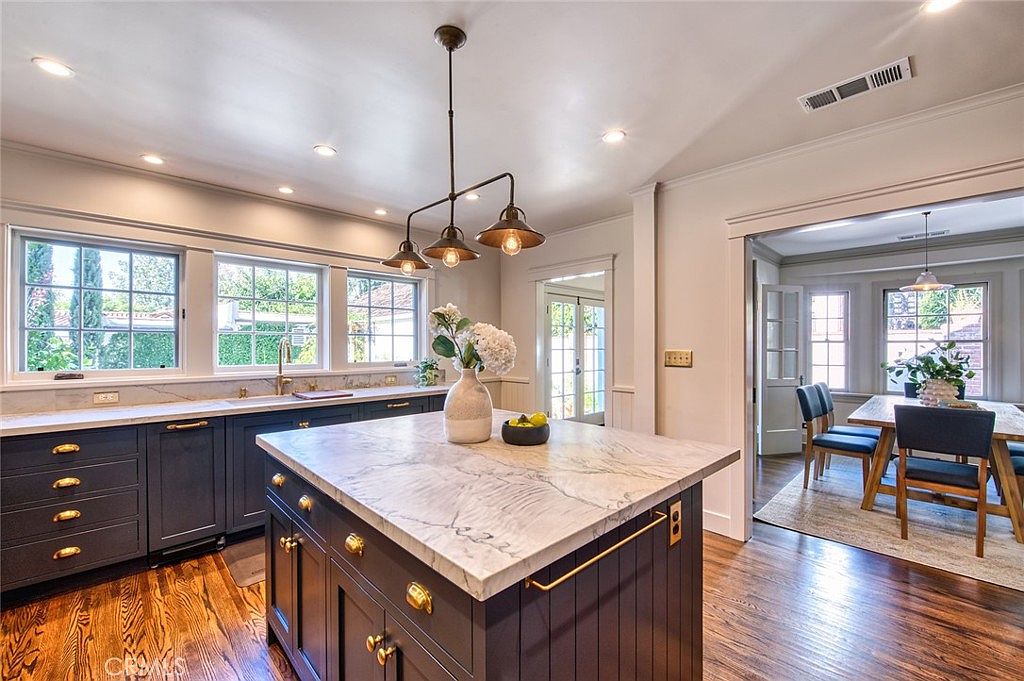 Spacious kitchen with a central marble-topped island featuring dark cabinetry and brass hardware, complemented by a trio of vintage-style brass pendant lights overhead. The perimeter counters are also marble, with matching dark lower cabinets and a farmhouse sink set below a wide row of windows, letting natural light flood the space. Warm wood floors add richness and contrast. Through a wide doorway framed in white trim, a dining area is visible, furnished with a wooden table, upholstered navy chairs, and large windows. The overall aesthetic is airy and refined, balancing classic and contemporary design elements.