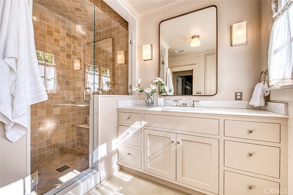 A bright bathroom features a large, cream-colored dual-sink vanity with polished silver fixtures and ample storage below. The countertop is a sleek white marble with subtle gray veining, decorated with fresh white flowers in a vase. Above, a large rectangular mirror with a slim, dark frame is flanked by two modern wall sconces emitting a soft, warm glow. To the left is a spacious walk-in shower, enclosed by clear glass and finished with tan, hand-laid square tiles that stretch up to the ceiling. Sunlight filters softly through a small curtained window, enhancing the inviting, serene atmosphere.