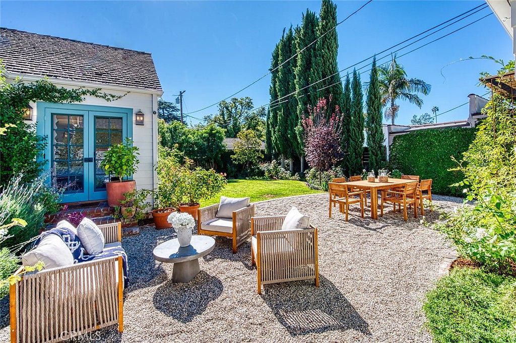 A charming courtyard patio designed with a relaxed, inviting atmosphere. The ground is covered in light gravel, bordered by garden beds with lush green plants and blooming flowers. A wooden dining table surrounded by six matching chairs sits at the center, with decorative lanterns as the table centerpiece. Beyond the dining area, a small sitting space features a cozy outdoor sofa and armchairs, complemented by potted plants for added greenery. The home’s exterior is painted crisp white with classic wood trim, and large windows allow plenty of natural light. Overarching trees cast gentle shade, contributing to the serene garden feel.