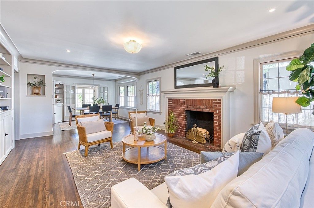 An open-concept living area flows seamlessly into the dining space, featuring rich dark wood flooring and soft gray walls that create a serene, airy atmosphere. The room is anchored by a red brick fireplace with a white mantle, accented by greenery and decorative pieces. A plush sofa and a pair of woven armchairs are arranged around a circular wooden coffee table atop a geometric-patterned rug. Built-in shelving and cabinetry line one wall, adding both storage and display space. Elegant archways and abundant windows fill the space with natural light, highlighting the room’s historic charm and understated sophistication.