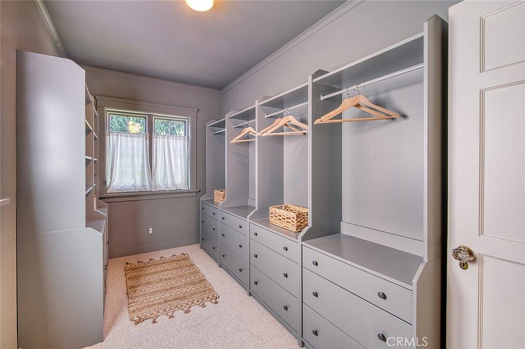 A spacious walk-in closet featuring built-in cabinetry painted in a soft gray shade, creating a unified and serene atmosphere. The cabinetry offers open shelving, hanging rods with several wooden hangers, and drawers for ample storage. Two woven baskets add a natural touch, complementing the neutral palette. A textured jute rug lies on the light carpeted floor, adding warmth and subtle contrast. A large window with sheer white curtains lets in natural light, framed by classic molding that matches the gray color scheme. The overall aesthetic feels clean, elegant, and practical, suitable for organized storage in a historic home.