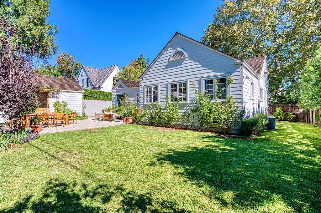 A lush green lawn stretches across the yard, bordered by mature trees, shrubs, and flowering plants. The main house showcases classic white siding with crisp trim and multiple windows, giving a cozy, historic cottage feel. A gravel pathway leads to a charming outdoor patio area with wooden dining furniture and potted plants, creating a welcoming spot for gatherings or relaxation. The landscape is thoughtfully maintained, blending open grass space with natural elements, while the bright blue sky and filtered sunlight accentuate the inviting, peaceful atmosphere of this well-kept backyard retreat.